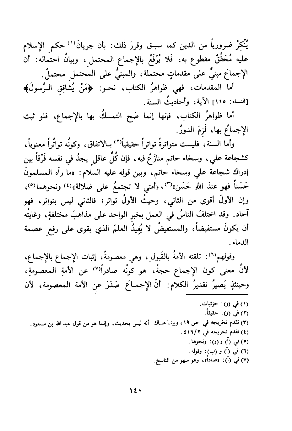 يُنْكِرُ ضَرُورِيًّا مِنَ الدِّينِ كَمَا سَبَقَ وَقُرِّرَ ذَلِكَ: بِأَنَّ جَرَيَانَ حُكْمِ الْإِسْلَامِ عَلَيْهِ مُحَقَّقٌ مَقْطُوعٌ بِهِ، فَلَا يُرْفَعُ بِالْإِجْمَاعِ الْمُحْتَمَلِ، وَبَيَانُ احْتِمَالِهِ: أَنَّ الْإِجْمَاعَ مَبْنِيٌّ عَلَى مُقَدِّمَاتٍ مُحْتَمَلَةٍ، وَالْمَبْنِيُّ عَلَى الْمُحْتَمَلِ مُحْتَمَلٌ.