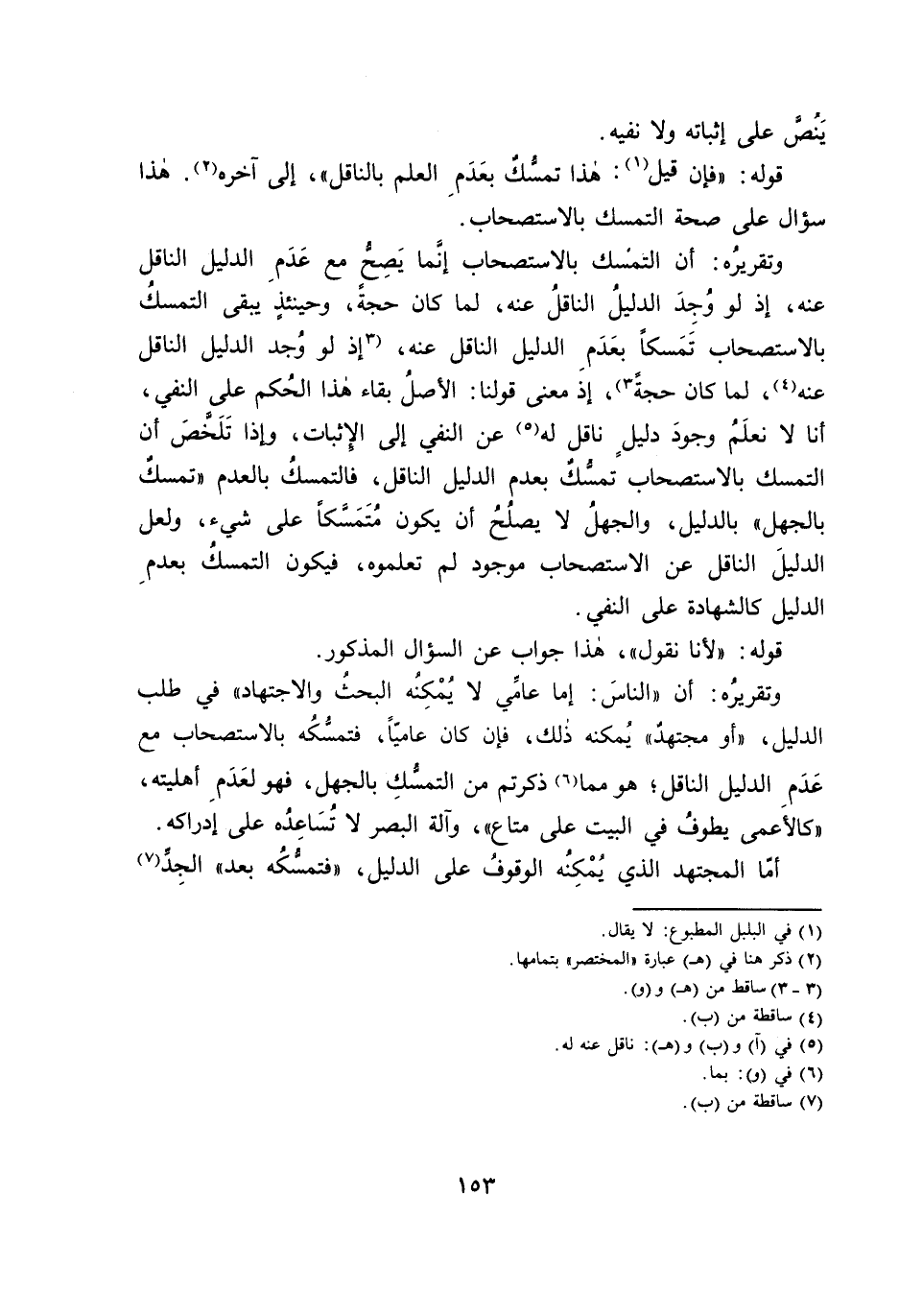 وَتَقْرِيرُهُ: أَنَّ التَّمَسُّكَ بِالِاسْتِصْحَابِ إِنَّمَا يَصِحُّ مَعَ عَدَمِ الدَّلِيلِ النَّاقِلِ عَنْهُ، إِذْ لَوْ وُجِدَ الدَّلِيلُ النَّاقِلُ عَنْهُ، لَمَا كَانَ حُجَّةً، وَحِينَئِذٍ يَبْقَى التَّمَسُّكُ بِالِاسْتِصْحَابِ تَمَسُّكًا بِعَدَمِ الدَّلِيلِ النَّاقِلِ عَنْهُ، إِذْ مَعْنَى قَوْلِنَا: الْأَصْلُ بَقَاءُ هَذَا الْحُكْمِ عَلَى النَّفْيِ، أَنَّا لَا نَعْلَمُ وُجُودَ دَلِيلٍ نَاقِلٍ لَهُ عَنِ النَّفْيِ إِلَى الْإِثْبَاتِ، وَإِذَا تَلَخَّصَ أَنَّ التَّمَسُّكَ بِالِاسْتِصْحَابِ تَمَسُّكٌ بِعَدَمِ الدَّلِيلِ النَّاقِلِ، فَالتَّمَسُّكُ بِالْعَدَمِ " تَمَسُّكٌ بِالْجَهْلِ " بِالدَّلِيلِ، وَالْجَهْلُ لَا يَصْلُحُ أَنْ يَكُونَ مُتَمَسَّكًا عَلَى شَيْءٍ، وَلَعَلَّ الدَّلِيلَ النَّاقِلَ عَنِ الِاسْتِصْحَابِ مَوْجُودٌ لَمْ تَعْلَمُوهُ، فَيَكُونُ التَّمَسُّكُ بِعَدَمِ الدَّلِيلِ كَالشَّهَادَةِ عَلَى النَّفْيِ.