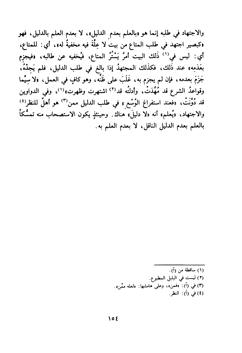وَالِاجْتِهَادِ فِي طَلَبِهِ إِنَّمَا هُوَ " بِالْعِلْمِ بِعَدَمِ الدَّلِيلِ " لَا بِعَدَمِ الْعِلْمِ بِالدَّلِيلِ، فَهُوَ " كَبَصِيرٍ اجْتَهَدَ فِي طَلَبِ الْمَتَاعِ مِنْ بَيْتٍ لَا عِلَّةَ فِيهِ مُخْفِيَةٌ لَهُ " أَيْ: لِلْمَتَاعِ، أَيْ: لَيْسَ فِي ذَلِكَ الْبَيْتِ أَمْرٌ يَسْتُرُ الْمَتَاعَ، فَيُخْفِيهِ عَنْ طَالِبِهِ " فَيَجْزِمُ بِعَدَمِهِ " عِنْدَ ذَلِكَ، فَكَذَلِكَ الْمُجْتَهِدُ إِذَا بَالَغَ فِي طَلَبِ الدَّلِيلِ، فَلَمْ يَجِدْهُ، جَزَمَ بِعَدَمِهِ، فَإِنْ لَمْ يَجْزِمْ بِهِ، غَلَبَ عَلَى ظَنِّهِ، وَهُوَ كَافٍ فِي الْعَمَلِ " لَا سِيَّمَا وَقَوَاعِدُ الشَّرْعِ قَدْ مُهِّدَتْ، وَأَدِلَّتُهُ قَدِ اشْتُهِرَتْ وَظَهَرَتْ " وَفِي الدَّوَاوِينِ قَدْ دُوِّنَتْ " فَعِنْدَ اسْتِفْرَاغِ الْوُسْعِ " فِي طَلَبِ الدَّلِيلِ مِمَّنْ هُوَ أَهْلٌ لِلنَّظَرِ وَالِاجْتِهَادِ " يُعْلَمُ " أَنَّهُ " لَا دَلِيلَ " هُنَاكَ. وَحِينَئِذٍ يَكُونُ الِاسْتِصْحَابُ مِنْهُ تَمَسُّكًا بِالْعِلْمِ بِعَدَمِ الدَّلِيلِ النَّاقِلِ، لَا بِعَدَمِ الْعِلْمِ بِهِ.