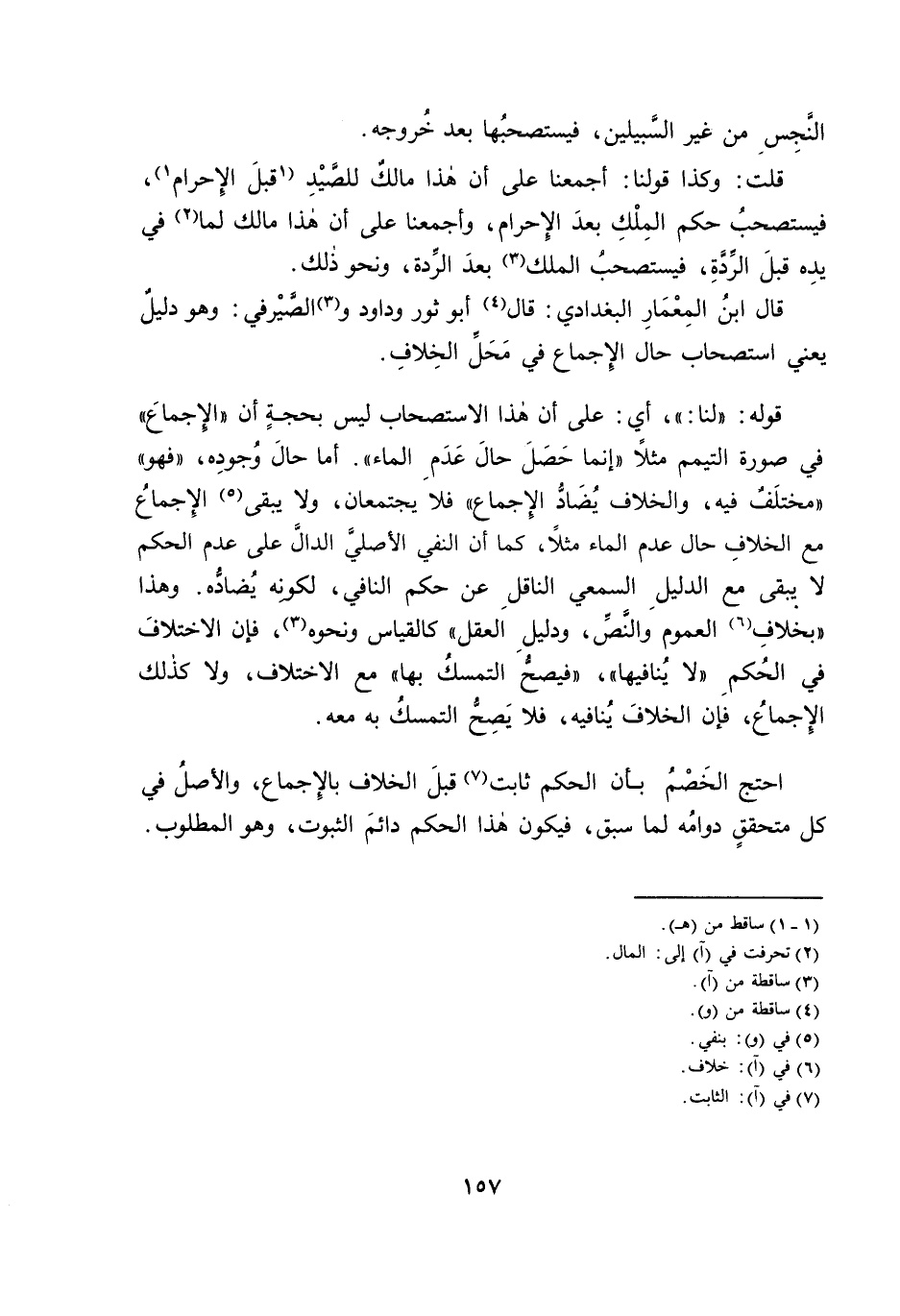 قُلْتُ: وَكَذَا قَوْلُنَا: أَجْمَعْنَا عَلَى أَنَّ هَذَا مَالِكٌ لِلصَّيْدِ قَبْلَ الْإِحْرَامِ، فَيَسْتَصْحِبُ حُكْمَ الْمِلْكِ بَعْدَ الْإِحْرَامِ، وَأَجْمَعْنَا عَلَى أَنَّ هَذَا مَالِكٌ لِمَا فِي يَدِهِ قَبْلَ الرِّدَّةِ، فَيَسْتَصْحِبُ الْمِلْكَ بَعْدَ الرِّدَّةِ، وَنَحْوَ ذَلِكَ.