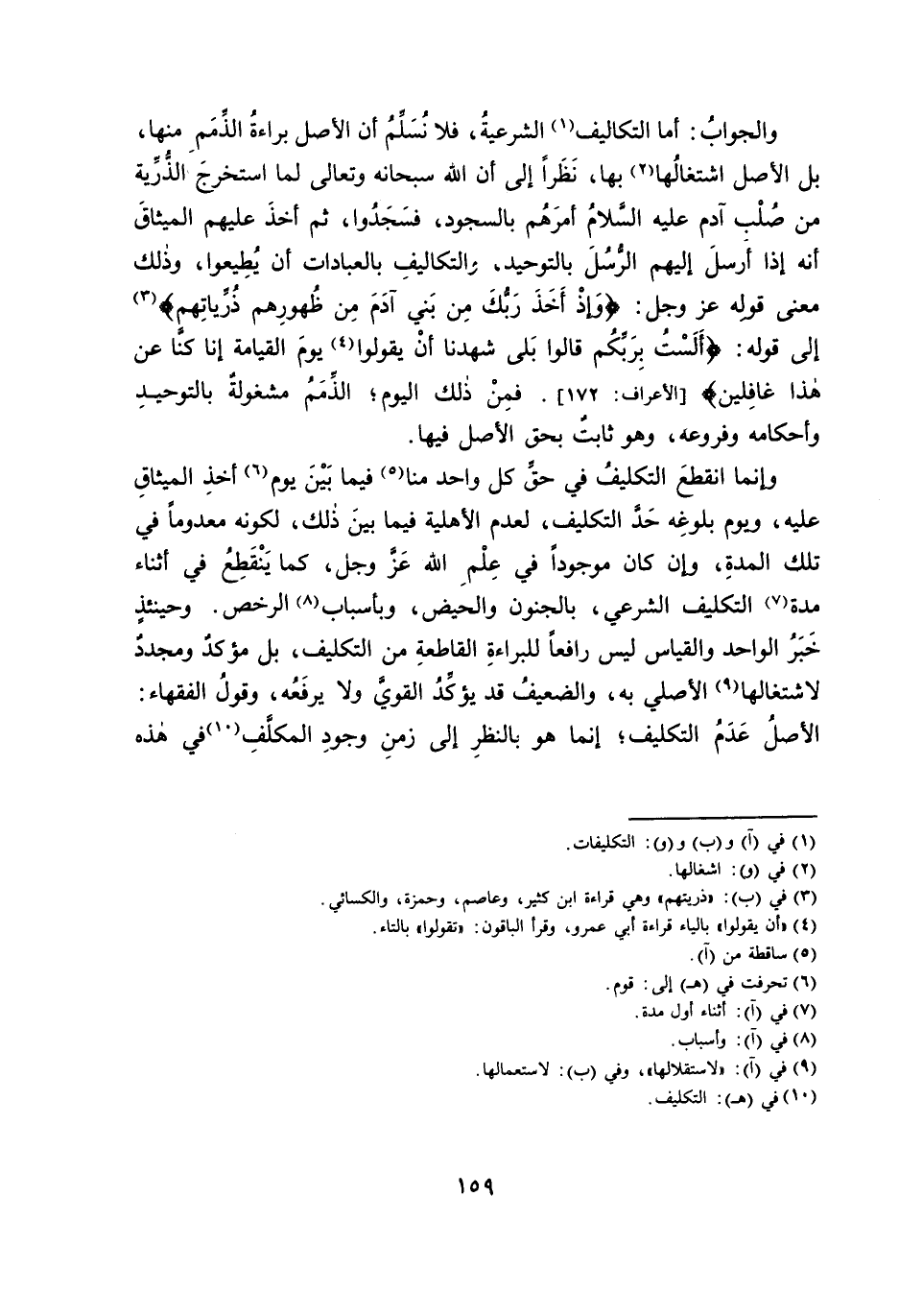 وَالْجَوَابُ: أَمَّا التَّكَالِيفُ الشَّرْعِيَّةُ، فَلَا نُسَلِّمُ أَنَّ الْأَصْلَ بَرَاءَةُ الذِّمَمِ مِنْهَا، بَلِ الْأَصْلُ اشْتِغَالُهَا بِهَا، نَظَرًا إِلَى أَنَّ اللَّهَ - سُبْحَانَهُ وَتَعَالَى - لَمَّا اسْتَخْرَجَ الذُّرِّيَّةَ مِنْ صُلْبِ آدَمَ - عَلَيْهِ السَّلَامُ - أَمَرَهُمْ بِالسُّجُودِ، فَسَجَدُوا، ثُمَّ أَخَذَ عَلَيْهِمُ الْمِيثَاقَ أَنَّهُ إِذَا أَرْسَلَ إِلَيْهِمُ الرُّسُلَ بِالتَّوْحِيدِ، وَالتَّكَالِيفِ بِالْعِبَادَاتِ أَنْ يُطِيعُوا، وَذَلِكَ مَعْنَى قَوْلِهِ - عَزَّ وَجَلَّ -: {وَإِذْ أَخَذَ رَبُّكَ مِنْ بَنِي آدَمَ مِنْ ظُهُورِهِمْ ذُرِّيَّتَهُمْ} إِلَى قَوْلِهِ: {أَلَسْتُ بِرَبِّكُمْ قَالُوا بَلَى شَهِدْنَا أَنْ تَقُولُوا يَوْمَ الْقِيَامَةِ إِنَّا كُنَّا عَنْ هَذَا غَافِلِينَ} [الْأَعْرَافِ: 172] . فَمِنْ ذَلِكَ الْيَوْمِ ; الذِّمَمُ مَشْغُولَةٌ بِالتَّوْحِيدِ وَأَحْكَامِهِ وَفُرُوعِهِ، وَهُوَ ثَابِتٌ بِحَقِّ الْأَصْلِ فِيهَا.