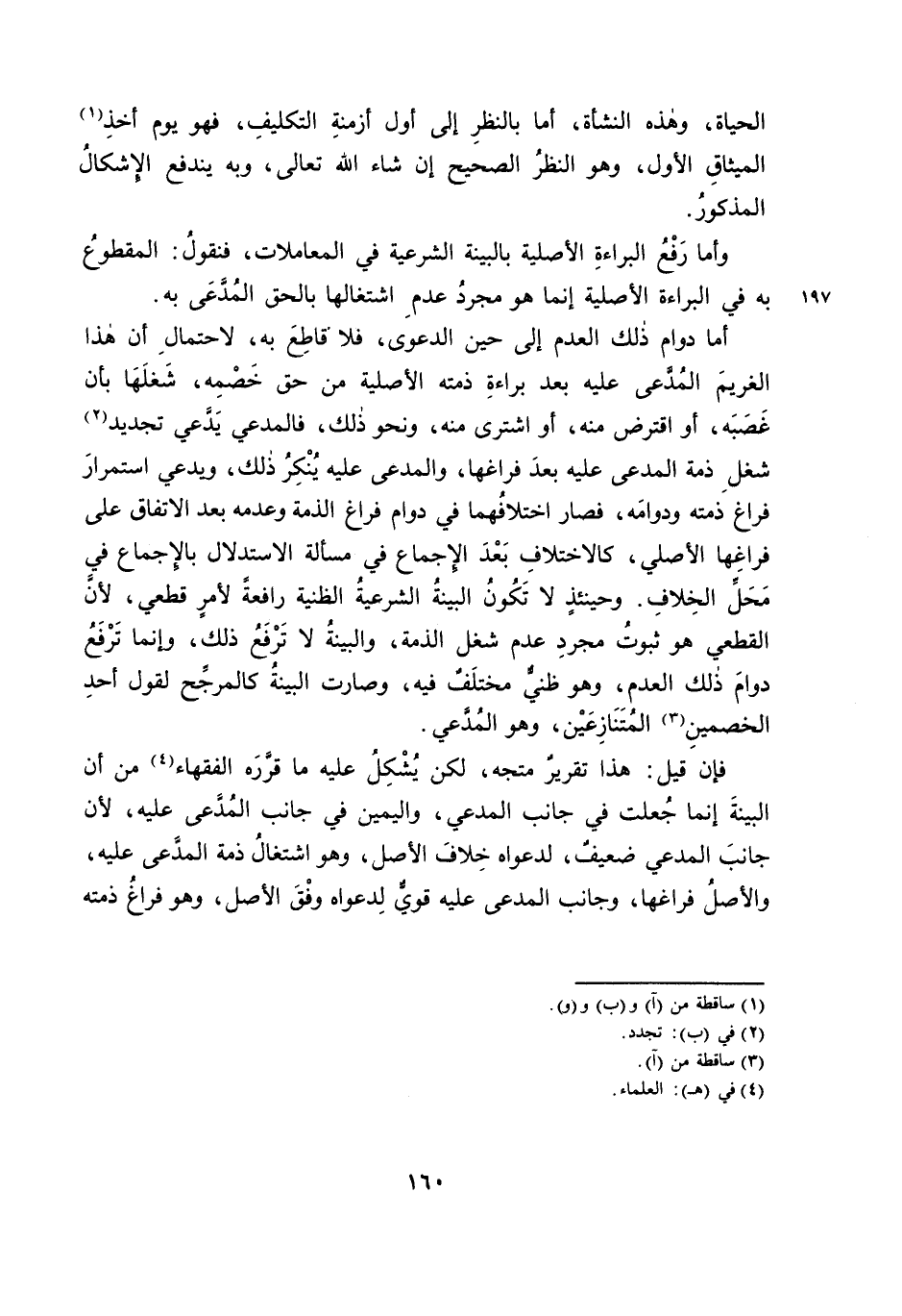 أَمَّا دَوَامُ ذَلِكَ الْعَدَمِ إِلَى حِينِ الدَّعْوَى، فَلَا قَاطِعَ بِهِ، لِاحْتِمَالِ أَنَّ هَذَا الْغَرِيمَ الْمُدَّعَى عَلَيْهِ بَعْدَ بَرَاءَةِ ذِمَّتِهِ الْأَصْلِيَّةِ مِنْ حَقِّ خَصْمِهِ، شَغَلَهَا بِأَنْ غَصَبَهُ، أَوِ اقْتَرَضَ مِنْهُ، أَوِ اشْتَرَى مِنْهُ، وَنَحْوُ ذَلِكَ، فَالْمُدَّعِي يَدَّعِي تَجْدِيدَ شَغْلِ ذِمَّةِ الْمُدَّعَى عَلَيْهِ بَعْدَ فَرَاغِهَا، وَالْمُدَّعَى عَلَيْهِ يُنْكِرُ ذَلِكَ، وَيَدَّعِي اسْتِمْرَارَ فَرَاغِ ذِمَّتِهِ وَدَوَامَهُ، فَصَارَ اخْتِلَافُهُمَا فِي دَوَامِ فَرَاغِ الذِّمَّةِ وَعَدَمِهِ بَعْدَ الِاتِّفَاقِ عَلَى فَرَاغِهَا الْأَصْلِيِّ، كَالِاخْتِلَافِ بَعْدَ الْإِجْمَاعِ فِي مَسْأَلَةِ الِاسْتِدْلَالِ بِالْإِجْمَاعِ فِي مَحَلِّ الْخِلَافِ. وَحِينَئِذٍ لَا تَكُونُ الْبَيِّنَةُ الشَّرْعِيَّةُ الظَّنِّيَّةُ رَافِعَةً لِأَمْرٍ قَطْعِيٍّ، لِأَنَّ الْقَطْعِيَّ هُوَ ثُبُوتُ مُجَرَّدِ عَدَمِ شَغْلِ الذِّمَّةِ، وَالْبَيِّنَةُ لَا تَرْفَعُ ذَلِكَ، وَإِنَّمَا تَرْفَعُ دَوَامَ ذَلِكَ الْعَدَمِ، وَهُوَ ظَنِّيٌّ مُخْتَلَفٌ فِيهِ، وَصَارَتِ الْبَيِّنَةُ كَالْمُرَجِّحِ لِقَوْلِ أَحَدِ الْخَصْمَيْنِ الْمُتَنَازِعَيْنِ، وَهُوَ الْمُدَّعِي.