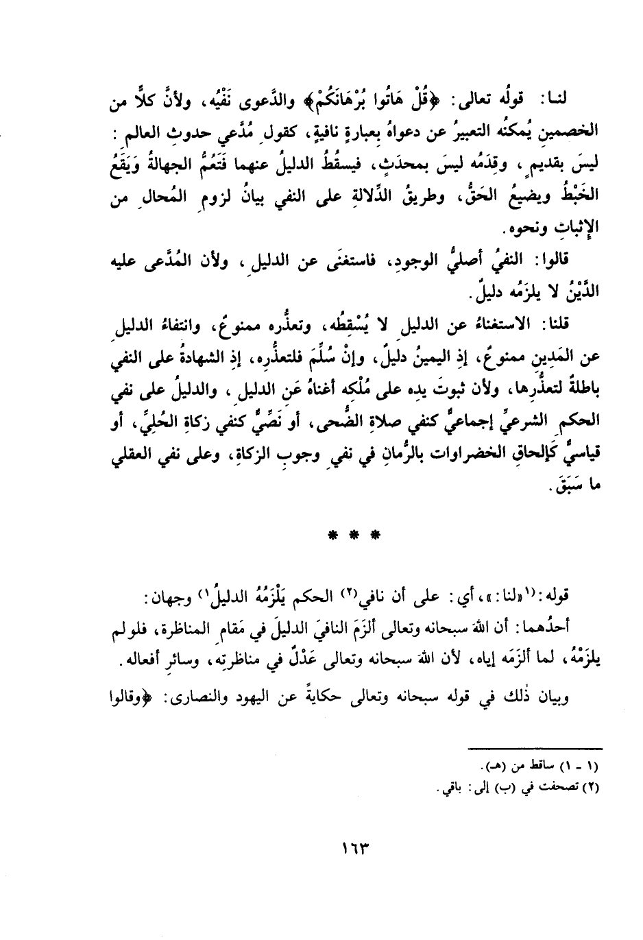 لَنَا: قَوْلُهُ تَعَالَى: {قُلْ هَاتُوا بُرْهَانَكُمْ} وَالدَّعْوَى نَفْيُهُ، وَلِأَنَّ كُلًّا مِنَ الْخَصْمَيْنِ يُمْكِنُهُ التَّعْبِيرُ عَنْ دَعْوَاهُ بِعِبَارَةٍ نَافِيَةٍ، كَقَوْلِ مُدَّعِي حُدُوثَ الْعَالَمِ: لَيْسَ بِقَدِيمٍ، وَقِدَمُهُ لَيْسَ بِمُحْدَثٍ، فَيَسْقُطُ الدَّلِيلُ عَنْهُمَا فَتَعُمُّ الْجَهَالَةُ وَيَقَعُ الْخَبْطُ وَيَضِيعُ الْحَقُّ، وَطَرِيقُ الدَّلَالَةِ عَلَى النَّفْيِ بَيَانُ لُزُومِ الْمُحَالِ مِنَ الْإِثْبَاتِ وَنَحْوِهِ.