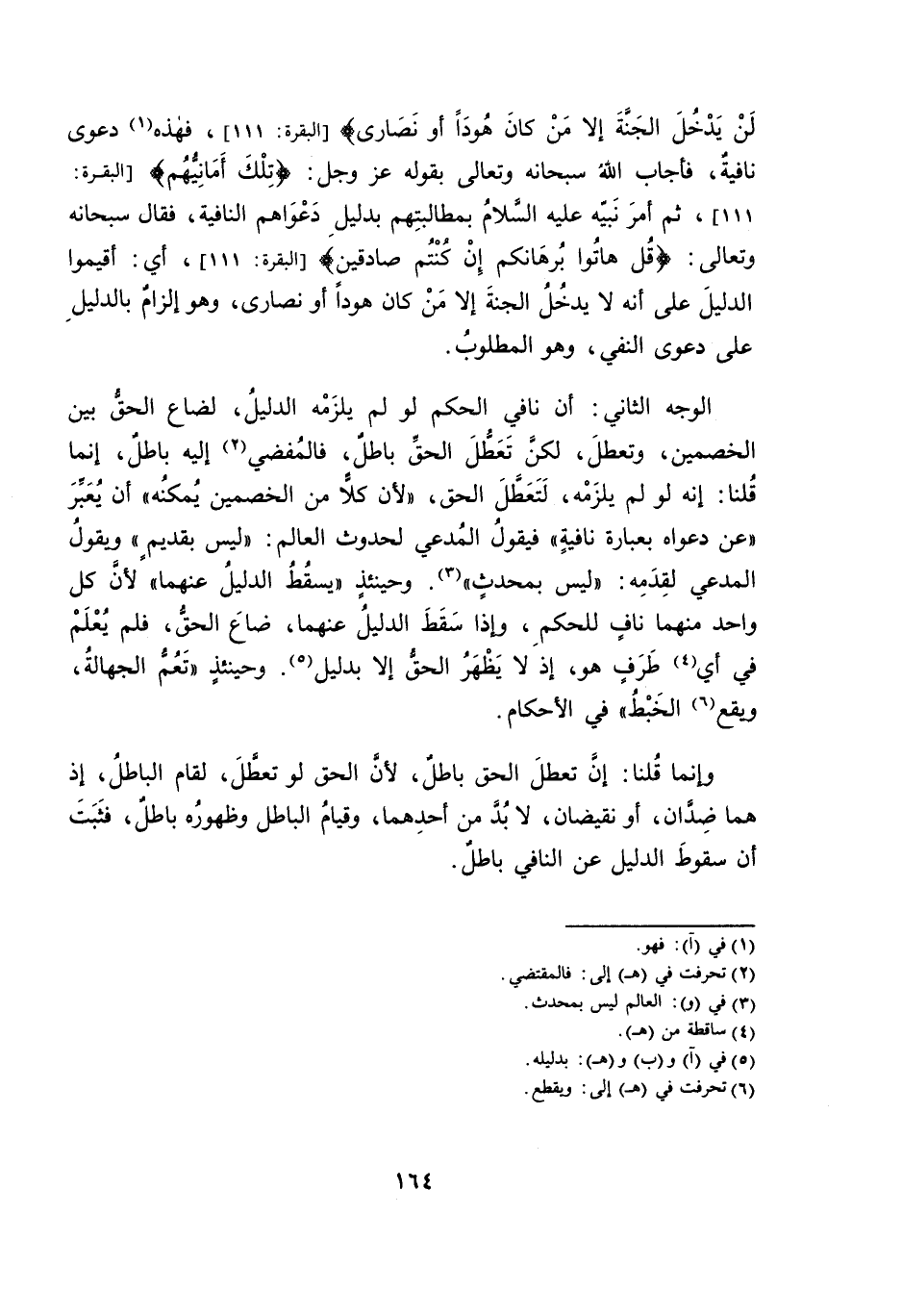 {وَقَالُوا لَنْ يَدْخُلَ الْجَنَّةَ إِلَّا مَنْ كَانَ هُودًا أَوْ نَصَارَى} [الْبَقَرَةِ: 111] ، فَهَذِهِ دَعْوَى نَافِيَةٌ، فَأَجَابَ اللَّهُ - سُبْحَانَهُ وَتَعَالَى - بِقَوْلِهِ - عَزَّ وَجَلَّ - {تِلْكَ أَمَانِيُّهُمْ} [الْبَقَرَةِ: 111] ، ثُمَّ أَمَرَ نَبِيَّهُ - عَلَيْهِ السَّلَامُ - بِمُطَالَبَتِهِمْ بِدَلِيلِ دَعْوَاهُمُ النَّافِيَةِ، فَقَالَ - سُبْحَانَهُ وَتَعَالَى: {قُلْ هَاتُوا بُرْهَانَكُمْ إِنْ كُنْتُمْ صَادِقِينَ} [الْبَقَرَةِ: 111] ، أَيْ: أَقِيمُوا الدَّلِيلَ عَلَى أَنَّهُ لَا يَدْخُلُ الْجَنَّةَ إِلَّا مَنْ كَانَ هُودًا أَوْ نَصَارَى، وَهُوَ إِلْزَامٌ بِالدَّلِيلِ عَلَى دَعْوَى النَّفْيِ، وَهُوَ الْمَطْلُوبُ.