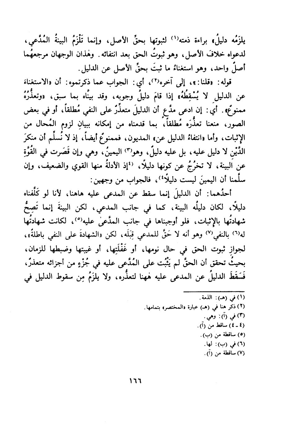 قَوْلُهُ: «قُلْنَا:» إِلَى آخِرِهِ، أَيِ: الْجَوَابُ عَمَّا ذَكَرْتُمُوهُ: أَنَّ «الِاسْتِغْنَاءَ عَنِ الدَّلِيلِ لَا يُسْقِطُهُ» إِذَا قَامَ دَلِيلُ وُجُوبِهِ، وَقَدْ بَيَّنَّاهُ بِمَا سَبَقَ، «وَتَعَذُّرُهُ مَمْنُوعٌ» . أَيْ: إِنِ ادَّعَى مُدَّعٍ أَنَّ الدَّلِيلَ مُتَعَذِّرٌ عَلَى النَّفْيِ مُطْلَقًا، أَوْ فِي بَعْضِ الصُّوَرِ، مَنَعْنَا تَعَذُّرَهُ مُطْلَقًا بِمَا قَدَّمْنَاهُ مِنْ إِمْكَانِهِ بِبَيَانِ لُزُومِ الْمُحَالِ مِنَ الْإِثْبَاتِ، وَأَمَّا «انْتِفَاءُ الدَّلِيلِ عَنِ» الْمَدْيُونِ، فَمَمْنُوعٌ أَيْضًا، إِذْ لَا نُسَلِّمُ أَنَّ مُنْكِرَ الدَّيْنِ لَا دَلِيلَ عَلَيْهِ، بَلْ عَلَيْهِ دَلِيلٌ، وَهُوَ الْيَمِينُ، وَهِيَ وَإِنْ قَصُرَتْ فِي الْقُوَّةِ عَنِ الْبَيِّنَةِ، لَا تَخْرُجُ عَنْ كَوْنِهَا دَلِيْلًا، إِذِ الْأَدِلَّةُ مِنْهَا الْقَوِيُّ وَالضَّعِيفُ، وَإِنْ سَلَّمْنَا أَنَّ الْيَمِينَ لَيْسَتْ دَلِيلًا، فَالْجَوَابُ مِنْ وَجْهَيْنِ:
