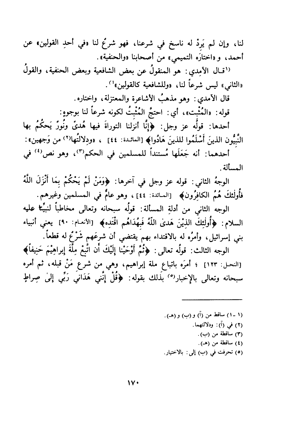 أَحَدُهَا: قَوْلُهُ - عَزَّ وَجَلَّ: {إِنَّا أَنْزَلْنَا التَّوْرَاةَ فِيهَا هُدًى وَنُورٌ يَحْكُمُ بِهَا النَّبِيُّونَ الَّذِينَ أَسْلَمُوا لِلَّذِينَ هَادُوا} [الْمَائِدَةِ: 44] " وَدَلَالَتُهَا مِنْ وَجْهَيْنِ ":