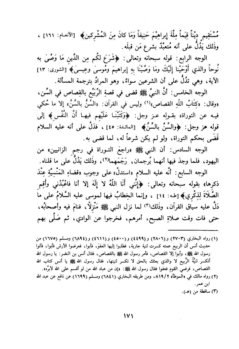 الْوَجْهُ السَّادِسُ: أَنَّ النَّبِيَّ - صَلَّى اللَّهُ عَلَيْهِ وَسَلَّمَ - " رَاجَعَ التَّوْرَاةَ فِي رَجْمِ الزَّانِيَيْنِ " مِنَ الْيَهُودِ، فَلَمَّا وَجَدَ فِيهَا أَنَّهُمَا يُرْجَمَانِ، رَجَمَهُمَا، وَذَلِكَ يَدُلُّ عَلَى مَا قُلْنَاهُ.
