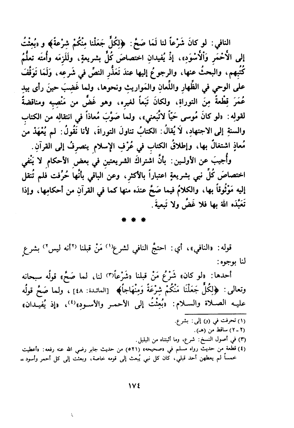 النَّافِي: لَوْ كَانَ شَرْعًا لَنَا لَمَا صَحَّ: {لِكُلٍّ جَعَلْنَا مِنْكُمْ شِرْعَةً} وَ «بُعِثْتُ إِلَى الْأَحْمَرِ وَالْأَسْوَدِ» ، إِذْ يُفِيدَانِ اخْتِصَاصَ (كُلٍّ) بِشَرِيعَةٍ، وَلَلَزِمَهُ وَأُمَّتَهُ تَعَلُّمُ كُتُبِهِمْ، وَالْبَحْثُ عَنْهَا، وَالرُّجُوعُ إِلَيْهَا عِنْدَ تَعَذُّرِ النَّصِّ فِي شَرْعِهِ، وَلَمَا تَوَقَّفَ عَلَى الْوَحْيِ فِي الظِّهَارِ وَاللِّعَانِ وَالْمَوَارِيثِ وَنَحْوِهَا، وَلَمَا غَضِبَ حِينَ رَأَى بِيَدِ عُمَرَ قِطْعَةً مِنَ التَّوْرَاةِ، وَلَكَانَ تَبَعًا لِغَيْرِهِ، وَهُوَ غَضٌّ مِنْ مَنْصِبِهِ وَمُنَاقَضَةٌ لِقَوْلِهِ: «لَوْ كَانَ» مُوسَى حَيًّا لَاتَّبَعَنِي، وَلَمَا صَوَّبَ مُعَاذًا فِي انْتِقَالِهِ مِنَ الْكِتَابِ وَالسُّنَّةِ إِلَى الِاجْتِهَادِ، لَا يُقَالُ: الْكِتَابُ تَنَاوَلَ التَّوْرَاةَ؛ لِأَنَّا نَقُولُ: لَمْ يُعْهَدْ مِنْ مُعَاذٍ اشْتِغَالٌ بِهَا وَإِطْلَاقُ الْكِتَابِ فِي عُرْفِ الْإِسْلَامِ يَنْصَرِفُ إِلَى الْقُرْآنِ.