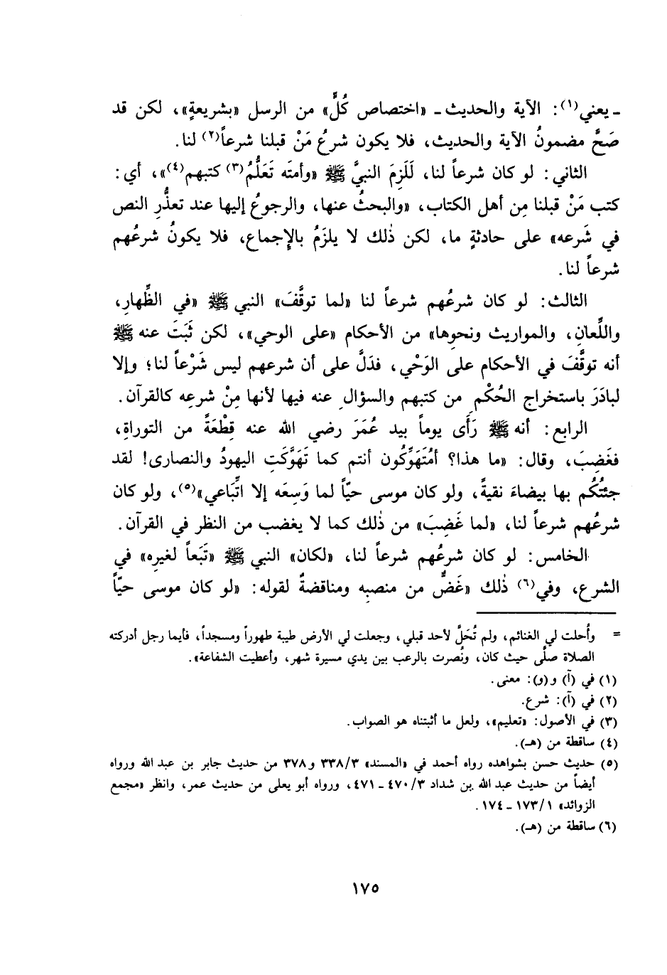 الرَّابِعُ: أَنَّهُ - صَلَّى اللَّهُ عَلَيْهِ وَسَلَّمَ - رَأَى يَوْمًا بِيَدِ عُمَرَ - رَضِيَ اللَّهُ عَنْهُ - قِطْعَةً مِنَ التَّوْرَاةِ، فَغَضِبَ، وَقَالَ: مَا هَذَا؟ أَمُتَهَوِّكُونَ أَنْتُمْ كَمَا تَهَوَّكَتِ الْيَهُودُ وَالنَّصَارَى! لَقَدْ جِئْتُكُمْ بِهَا بَيْضَاءَ نَقِيَّةً، وَلَوْ كَانَ مُوسَى حَيًّا لَمَا وَسِعَهُ إِلَّا اتِّبَاعِي، وَلَوْ كَانَ شَرْعُهُمْ شَرْعًا لَنَا، " لَمَا غَضِبَ " مِنْ ذَلِكَ كَمَا لَا يَغْضَبُ مِنَ النَّظَرِ فِي الْقُرْآنِ.