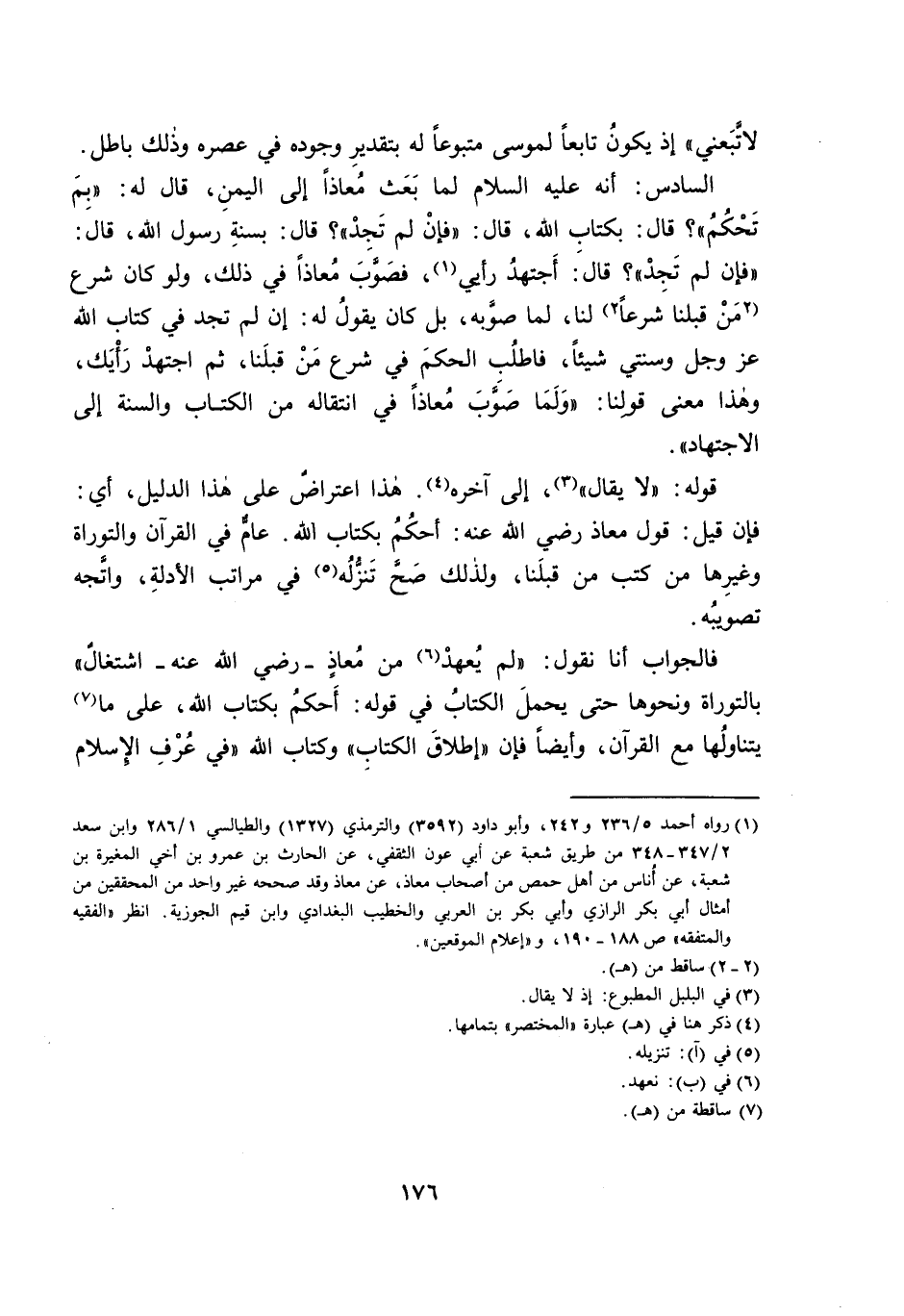 فَالْجَوَابُ أَنَّا نَقُولُ: " لَمْ يُعْهَدْ مِنْ مُعَاذٍ - رَضِيَ اللَّهُ عَنْهُ - اشْتِغَالٌ " بِالتَّوْرَاةِ وَنَحْوِهَا حَتَّى يُحْمَلَ الْكِتَابُ فِي قَوْلِهِ: أَحْكُمُ بِكِتَابِ اللَّهِ، عَلَى مَا يَتَنَاوَلُهَا مَعَ الْقُرْآنِ، وَأَيْضًا فَإِنَّ " إِطْلَاقَ الْكِتَابِ " وَكِتَابُ اللَّهِ " فِي عُرْفِ الْإِسْلَامِ
