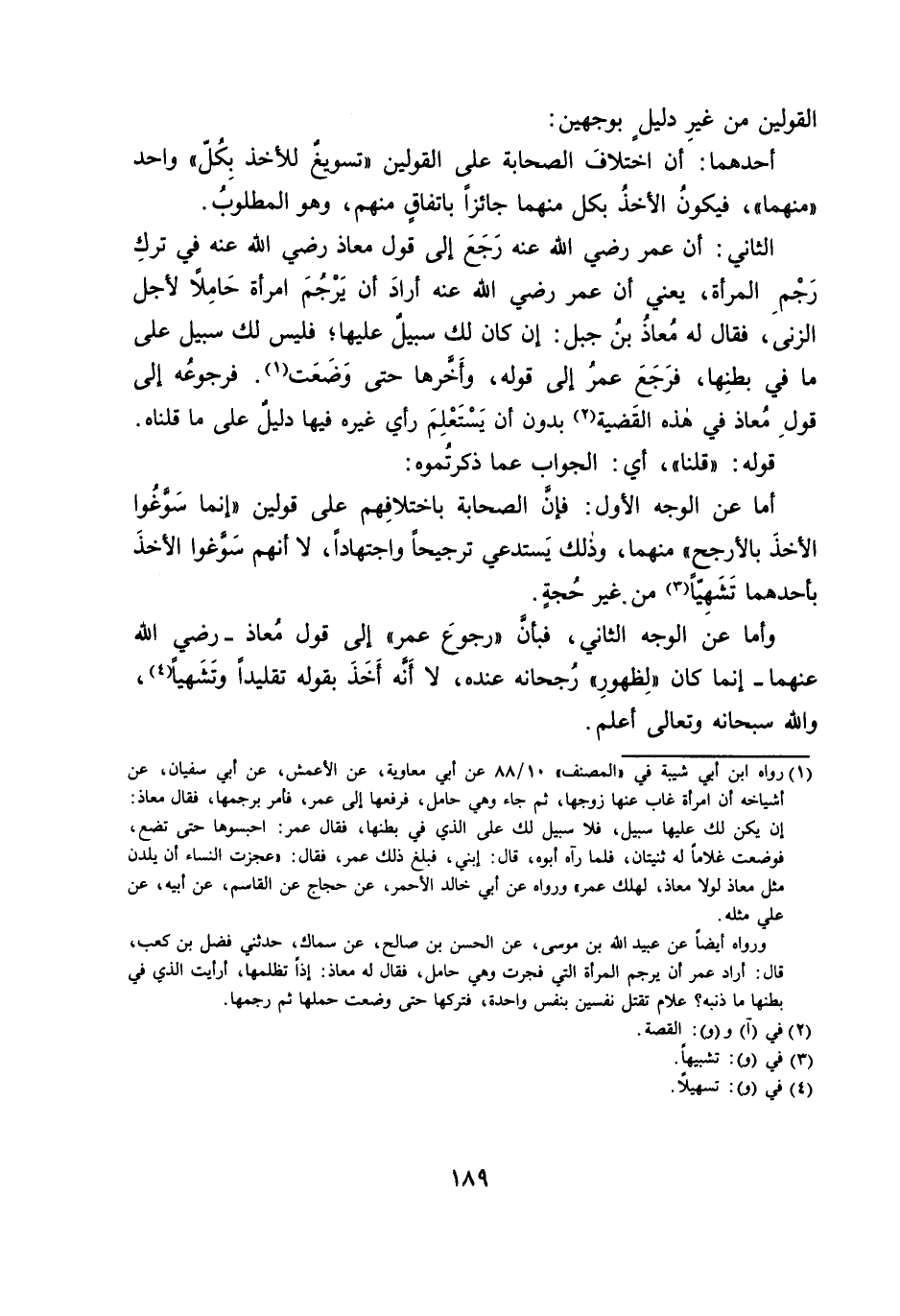 وَأَمَّا عَنِ الْوَجْهِ الثَّانِي، فَبِأَنَّ " رُجُوعَ عُمَرَ " إِلَى قَوْلِ مُعَاذٍ - رَضِيَ اللَّهُ عَنْهُمَا - إِنَّمَا كَانَ " لِظُهُورِ " رُجْحَانِهِ عِنْدَهُ، لَا أَنَّهُ أَخَذَ بُقُولِهِ تَقْلِيدًا وَتَشَهِّيًا، وَاللَّهُ - سُبْحَانَهُ وَتَعَالَى - أَعْلَمُ.