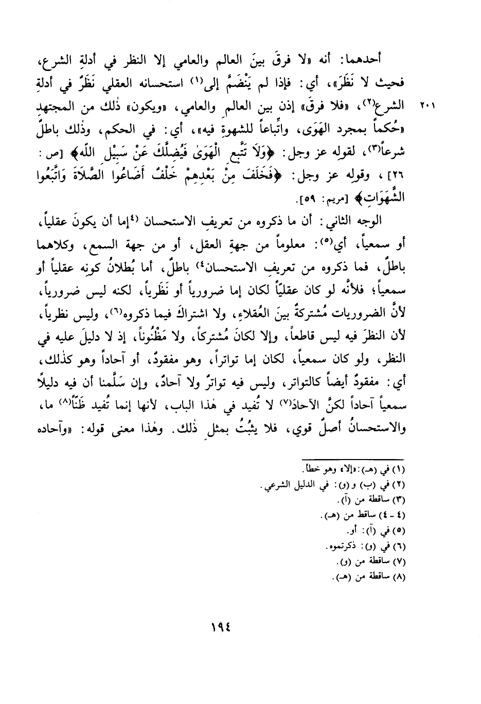 أَحَدُهُمَا: أَنَّهُ «لَا فَرْقَ بَيْنَ الْعَالِمِ وَالْعَامِّيِّ إِلَّا النَّظَرَ فِي أَدِلَّةِ الشَّرْعِ، فَحَيْثُ لَا نَظَرَ» ، أَيْ: فَإِذَا لَمْ يَنْضَمَّ إِلَى اسْتِحْسَانِهِ الْعَقْلِيِّ نَظَرٌ فِي أَدِلَّةِ الشَّرْعِ، «فَلَا فَرْقَ» إِذَنْ بَيْنَ الْعَالِمِ وَالْعَامِّيِّ، «وَيَكُونُ» ذَلِكَ مِنَ الْمُجْتَهِدِ «حُكْمًا بِمُجَرَّدِ الْهَوَى، وَاتِبَاعًا لِلشَّهْوَةِ فِيهِ» ، أَيْ: فِي الْحُكْمِ، وَذَلِكَ بَاطِلٌ شَرْعًا؛ لِقَوْلِهِ - عَزَّ وَجَلَّ: {وَلَا تَتَّبِعِ الْهَوَى فَيُضِلَّكَ عَنْ سَبِيلِ اللَّهِ} [ص: 26] ، وَقَوْلُهُ - عَزَّ وَجَلَّ: {فَخَلَفَ مِنْ بَعْدِهِمْ خَلْفٌ أَضَاعُوا الصَّلَاةَ وَاتَّبَعُوا الشَّهَوَاتِ} [مَرْيَمَ: 59] .