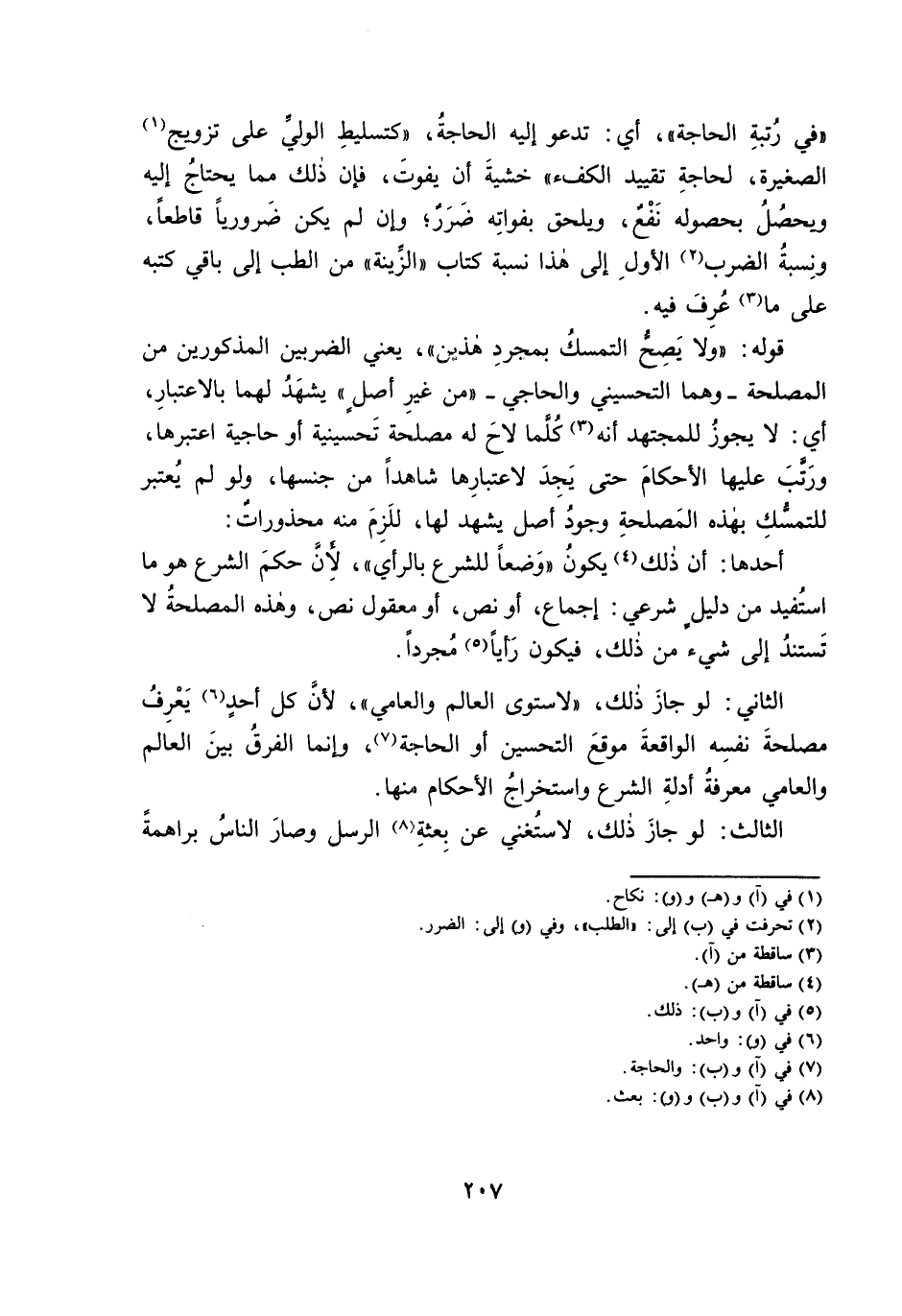قَوْلُهُ: «وَلَا يَصِحُّ التَّمَسُّكُ بِمُجَرَّدِ هَذَيْنِ» ، يَعْنِي الضَّرْبَيْنِ الْمَذْكُورَيْنِ مِنَ الْمَصْلَحَةِ وَهُمَا التَحْسِينِيُّ وَالْحَاجِيُّ «مِنْ غَيْرِ أَصْلٍ» يَشْهَدُ لَهُمَا بِالِاعْتِبَارِ، أَيْ: لَا يَجُوزُ لِلْمُجْتَهِدِ أَنَّهُ كُلَّمَا لَاحَ لَهُ مَصْلَحَةٌ تَحْسِينِيَّةٌ أَوْ حَاجِيَّةٌ اعْتَبَرَهَا، وَرَتَّبَ عَلَيْهَا الْأَحْكَامَ حَتَّى يَجِدَ لِاعْتِبَارِهَا شَاهِدًا مِنْ جِنْسِهَا، وَلَوْ لَمْ يُعْتَبَرْ لِلتَّمَسُّكِ بِهَذِهِ الْمَصْلَحَةِ وُجُودُ أَصْلٍ يَشْهَدُ لَهَا، لَلَزِمَ مِنْهُ مَحْذُورَاتٌ: