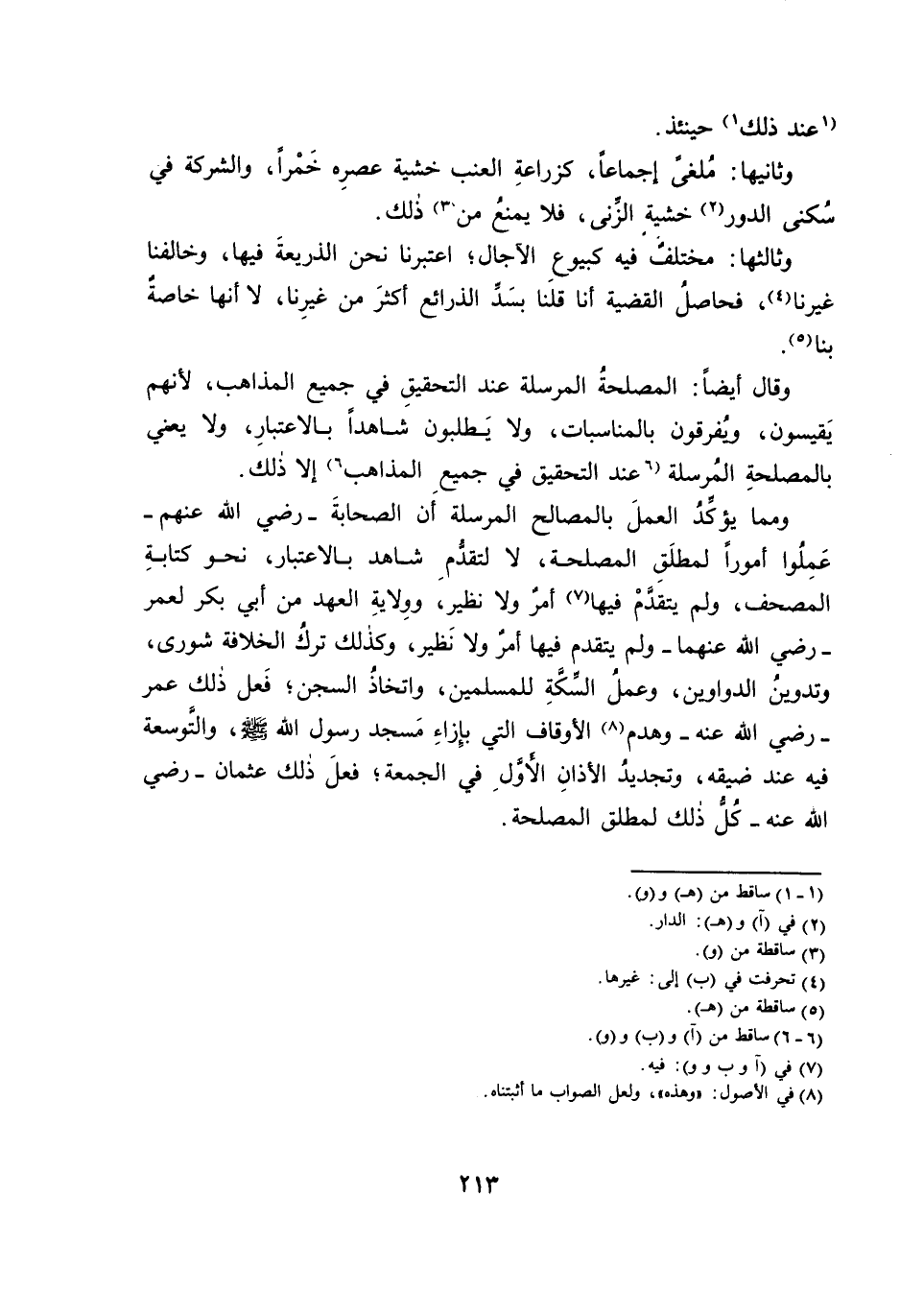 وَقَالَ أَيْضًا: الْمَصْلَحَةُ الْمُرْسَلَةُ عِنْدَ التَّحْقِيقِ فِي جَمِيعِ الْمَذَاهِبِ؛ لِأَنَّهُمْ يَقِيسُونَ، وَيُفَرِّقُونَ بِالْمُنَاسَبَاتِ، وَلَا يَطْلُبُونَ شَاهِدًا بِالِاعْتِبَارِ، وَلَا يُعْنَى بِالْمَصْلَحَةِ الْمُرْسَلَةِ عِنْدَ التَّحْقِيقِ فِي جَمِيعِ الْمَذَاهِبِ إِلَّا ذَلِكَ.