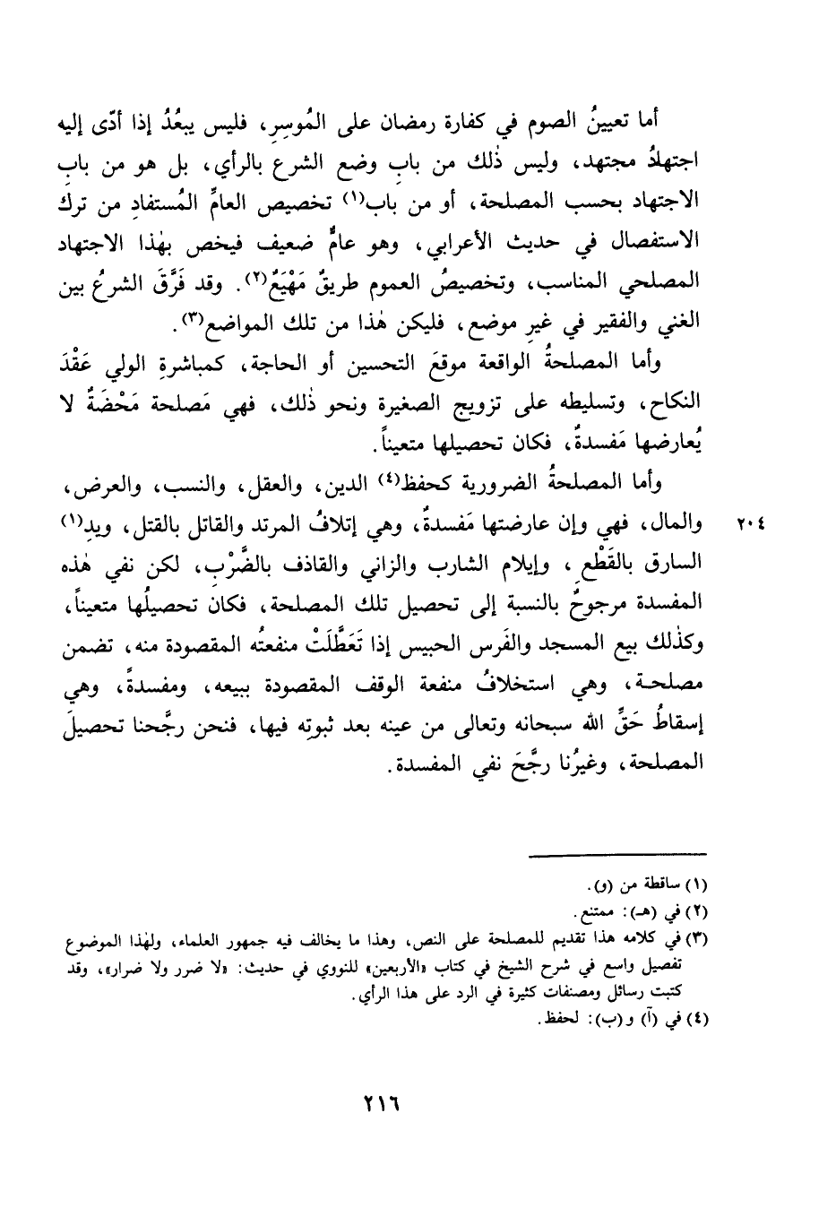 أَمَّا تَعْيِينُ الصَّوْمِ فِي كَفَّارَةِ رَمَضَانَ عَلَى الْمُوسِرِ، فَلَيْسَ يَبْعُدُ إِذَا أَدَّى إِلَيْهِ اجْتِهَادُ مُجْتَهِدٍ، وَلَيْسَ ذَلِكَ مِنْ بَابِ وَضْعِ الشَّرْعِ بِالرَّأْيِ، بَلْ هُوَ مِنْ بَابِ الِاجْتِهَادِ بِحَسَبِ الْمَصْلَحَةِ، أَوْ مِنْ بَابِ تَخْصِيصِ الْعَامِّ الْمُسْتَفَادِ مِنْ تَرْكِ الِاسْتِفْصَالِ فِي حَدِيثِ الْأَعْرَابِيِّ، وَهُوَ عَامٌّ ضَعِيفٌ فَيُخَصُّ بِهَذَا الِاجْتِهَادِ الْمَصْلَحِيِّ الْمُنَاسِبِ، وَتَخْصِيصُ الْعُمُومِ طَرِيقٌ مَهْيَعٌ. وَقَدْ فَرَّقَ الشَّرْعُ بَيْنَ الْغَنِيِّ وَالْفَقِيرِ فِي غَيْرِ مَوْضِعٍ، فَلْيَكُنْ هَذَا مِنْ تِلْكَ الْمَوَاضِعِ.