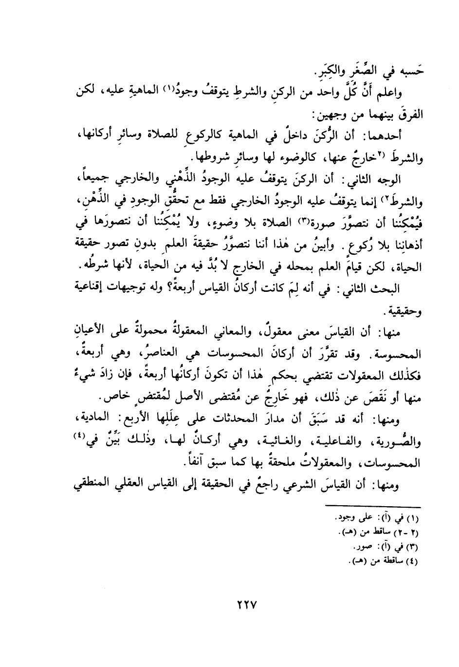 الْبَحْثُ الثَّانِي: فِي أَنَّهُ لِمَ كَانَتْ أَرْكَانُ الْقِيَاسِ أَرْبَعَةً؟ وَلَهُ تَوْجِيهَاتٌ إِقْنَاعِيَّةٌ وَحَقِيقِيَّةٌ.
