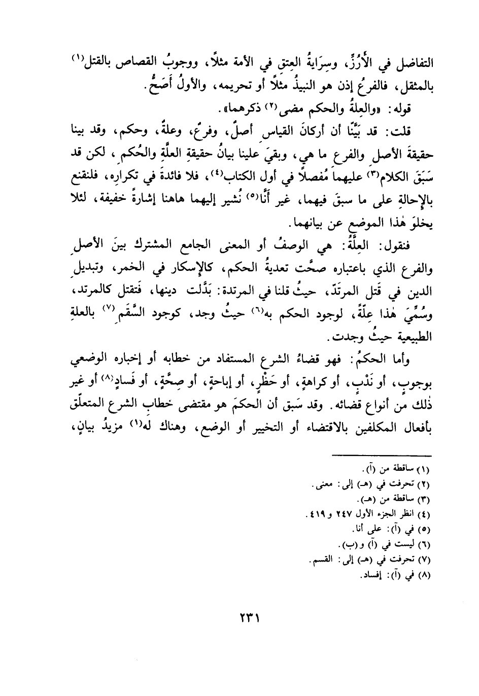 قُلْتُ: قَدْ بَيَّنَّا أَنَّ أَرْكَانَ الْقِيَاسِ أَصْلٌ، وَفَرْعٌ، وَعِلَّةٌ، وَحُكْمٌ، وَقَدْ بَيَّنَّا حَقِيقَةَ الْأَصْلِ وَالْفَرْعِ مَا هِيَ، وَبَقِيَ عَلَيْنَا بَيَانُ حَقِيقَةِ الْعِلَّةِ وَالْحُكْمِ، لَكِنْ قَدْ سَبَقَ الْكَلَامُ عَلَيْهِمَا مُفَصَّلًا فِي أَوَّلِ الْكِتَابِ، فَلَا فَائِدَةَ فِي تَكْرَارِهِ، فَلْنَقْنَعْ بِالْإِحَالَةِ عَلَى مَا سَبَقَ فِيهِمَا، غَيْرَ أَنَّا نُشِيرُ إِلَيْهِمَا هَاهُنَا إِشَارَةً خَفِيفَةً؛ لِئَلَّا يَخْلُوَ هَذَا الْمَوْضِعُ عَنْ بَيَانِهِمَا.