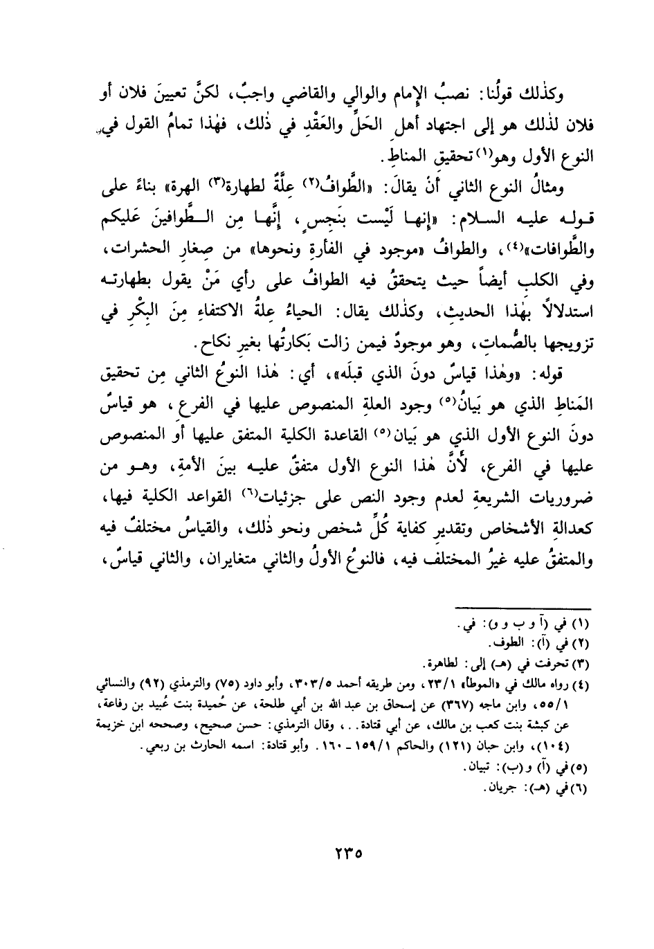 وَمِثَالُ النَّوْعِ الثَّانِي أَنْ يُقَالَ: «الطَّوَافُ عِلَّةٌ لِطَهَارَةِ الْهِرَّةِ» بِنَاءً عَلَى قَوْلِهِ - عَلَيْهِ السَّلَامُ: إِنَّهَا لَيْسَتْ بِنَجَسٍ، إِنَّهَا مِنَ الطَّوَّافِينَ عَلَيْكُمْ وَالطَّوَّافَاتِ، وَالطَّوَّافُ «مَوْجُودٌ فِي الْفَأْرَةِ وَنَحْوِهَا» مِنْ صِغَارِ الْحَشَرَاتِ، وَفِي الْكَلْبِ أَيْضًا حَيْثُ يَتَحَقَّقُ فِيهِ الطَّوَافُ عَلَى رَأْيِ مَنْ يَقُولُ بِطَهَارَتِهِ اسْتِدْلَالًا بِهَذَا الْحَدِيثِ، وَكَذَلِكَ يُقَالُ: الْحَيَاءُ عِلَّةُ الِاكْتِفَاءِ مِنَ الْبِكْرِ فِي تَزْوِيجِهَا بِالصُّمَاتِ، وَهُوَ مَوْجُودٌ فِيمَنْ زَالَتْ بَكَارَتُهَا بِغَيْرِ نِكَاحٍ.