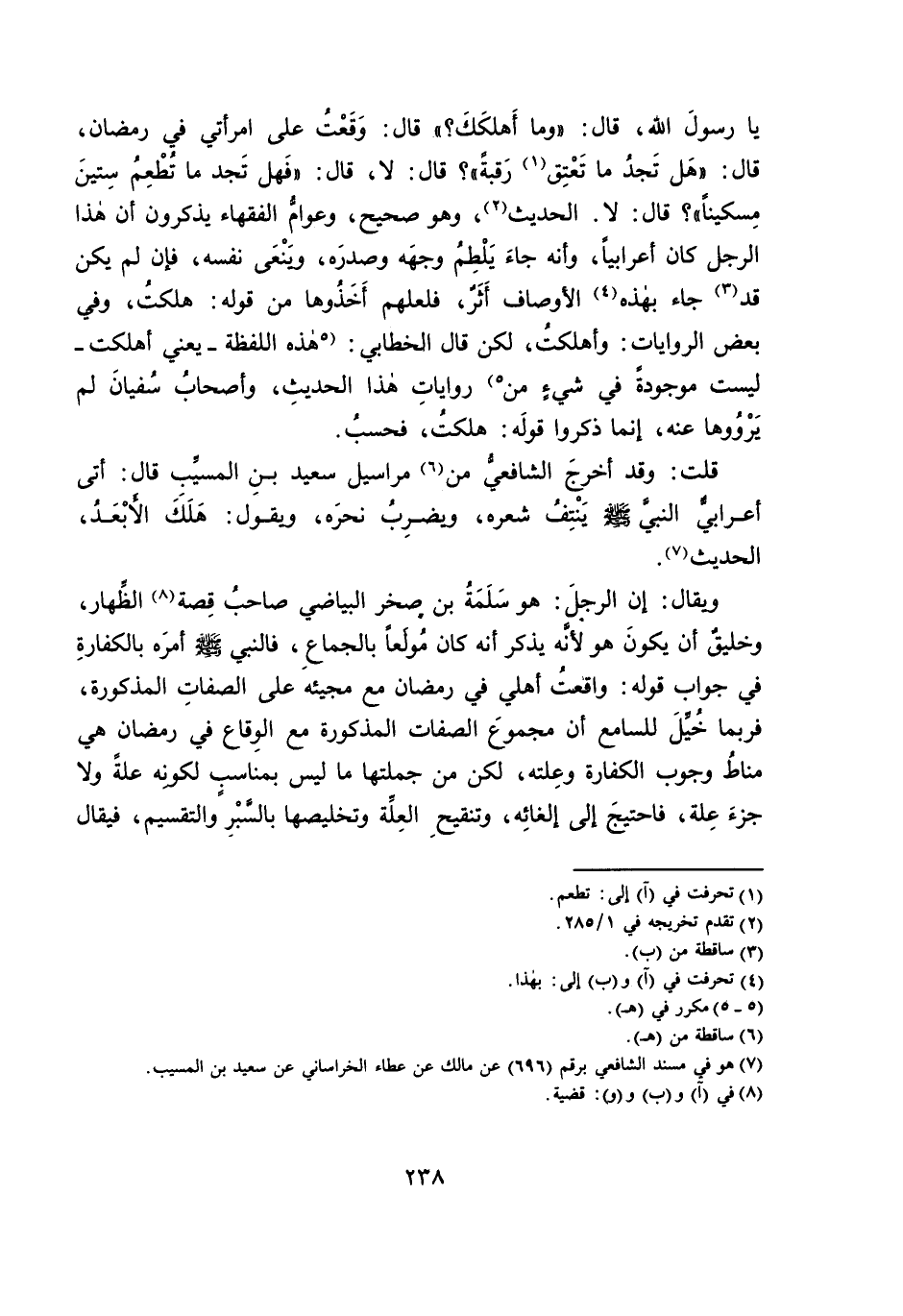 يَا رَسُولَ اللَّهِ، قَالَ: وَمَا أَهْلَكَكَ؟ قَالَ: وَقَعْتُ عَلَى امْرَأَتِي فِي رَمَضَانَ، قَالَ: هَلْ تَجِدُ مَا تَعْتِقُ رَقَبَةً؟ قَالَ: لَا، قَالَ: فَهَلْ تَجِدُ مَا تُطْعِمُ سِتِّينَ مِسْكِينًا؟ قَالَ: لَا. الْحَدِيثَ، وَهُوَ صَحِيحٌ، وَعَوَامُّ الْفُقَهَاءِ يَذْكُرُونَ أَنَّ هَذَا الرَّجُلَ كَانَ أَعْرَابِيًّا، وَأَنَّهُ جَاءَ يَلْطِمُ وَجْهَهُ وَصَدْرَهُ، وَيَنْعِي نَفْسَهُ، فَإِنْ لَمْ يَكُنْ قَدْ جَاءَ بِهَذِهِ الْأَوْصَافِ أَثَرٌ، فَلَعَلَّهُمْ أَخَذُوهَا مِنْ قَوْلِهِ: هَلَكْتُ، وَفِي بَعْضِ الرِّوَايَاتِ: وَأَهْلَكْتُ، لَكِنْ قَالَ الْخَطَّابِيُّ: هَذِهِ اللَّفْظَةُ يَعْنِي أَهْلَكْتُ لَيْسَتْ مَوْجُودَةً فِي شَيْءٍ مِنْ رِوَايَاتٍ هَذَا الْحَدِيثِ، وَأَصْحَابُ سُفْيَانَ لَمْ يَرْوُوهَا عَنْهُ، إِنَّمَا ذَكَرُوا قَوْلَهُ: هَلَكْتُ، فَحَسْبُ.