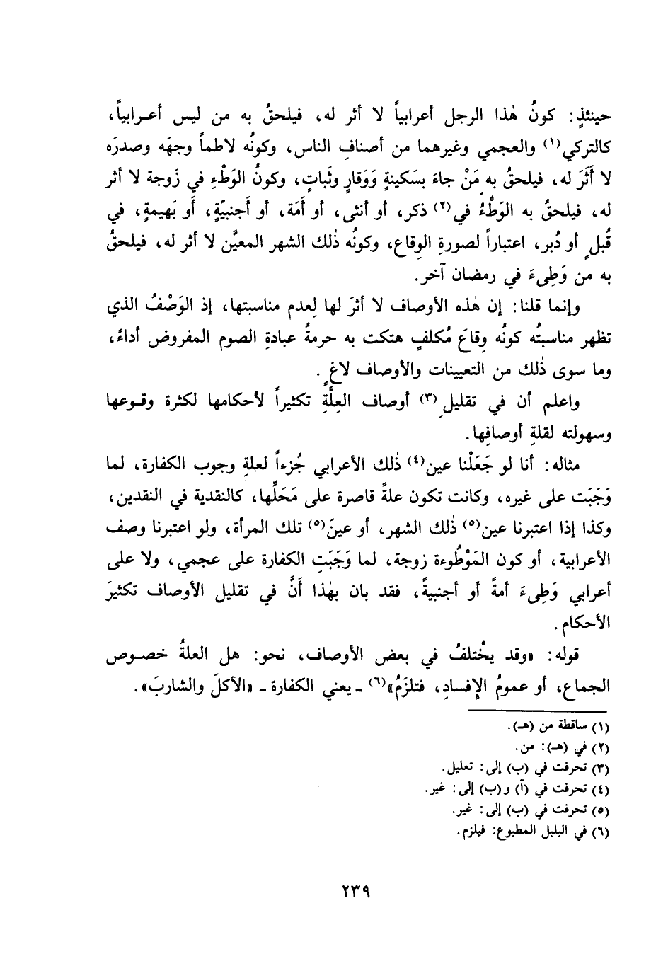 مِثَالُهُ: أَنَّا لَوْ جَعَلْنَا عَيْنَ ذَلِكَ الْأَعْرَابِيِّ جُزْءًا لِعِلَّةِ وُجُوبِ الْكَفَّارَةِ، لَمَا وَجَبَتْ عَلَى غَيْرِهِ، وَكَانَتْ تَكُونُ عِلَّةً قَاصِرَةً عَلَى مَحَلِّهَا، كَالنَّقْدِيَّةِ فِي النَّقْدَيْنِ، وَكَذَا إِذَا اعْتَبَرْنَا عَيْنَ ذَلِكَ الشَّهْرِ، أَوْ عَيْنَ تِلْكَ الْمَرْأَةِ، وَلَوِ اعْتَبَرْنَا وَصْفَ الْأَعْرَابِيَّةِ، أَوْ كَوْنَ الْمَوْطُوءَةِ زَوْجَةً، لَمَا وَجَبَتِ الْكَفَّارَةُ عَلَى عَجَمِيٍّ، وَلَا عَلَى أَعْرَابِيٍّ وَطِئَ أَمَةً أَوْ أَجْنَبِيَّةً، فَقَدْ بَانَ بِهَذَا أَنَّ فِي تَقْلِيلِ الْأَوْصَافِ تَكْثِيرَ الْأَحْكَامِ.