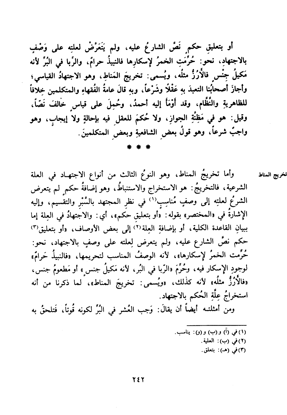 وَأَمَّا تَخْرِيجُ الْمَنَاطِ، وَهُوَ النَّوْعُ الثَّالِثُ مِنْ أَنْوَاعِ الِاجْتِهَادِ فِي الْعِلَّةِ الشَّرْعِيَّةِ، فَالتَّخْرِيجُ: هُوَ الِاسْتِخْرَاجُ وَالِاسْتِنْبَاطُ، وَهُوَ إِضَافَةُ حُكْمٍ لَمْ يَتَعَرَّضِ الشَّرْعُ لِعِلَّتِهِ إِلَى وَصْفٍ مُنَاسِبٍ فِي نَظَرِ الْمُجْتَهِدِ بِالسَّبْرِ وَالتَّقْسِيمِ، وَإِلَيْهِ الْإِشَارَةُ فِي «الْمُخْتَصَرِ» بِقَوْلِهِ: «أَوْ بِتَعْلِيقِ حُكْمٍ» ، أَيْ: وَالِاجْتِهَادُ فِي الْعِلَّةِ إِمَّا بِبَيَانِ الْقَاعِدَةِ الْكُلِّيَّةِ، أَوْ بِإِضَافَةِ الْعِلَّةِ إِلَى بَعْضِ الْأَوْصَافِ، «أَوْ بِتَعْلِيقِ حُكْمٍ نَصَّ الشَّارِعُ عَلَيْهِ، وَلَمْ يَتَعَرَّضْ لِعِلَّتِهِ عَلَى وَصْفٍ بِالِاجْتِهَادِ، نَحْوُ: حُرِّمَتِ الْخَمْرُ لِإِسْكَارِهَا» ؛ لِأَنَّهُ الْوَصْفُ الْمُنَاسِبُ لِتَحْرِيِمِهَا، «فَالنَّبِيذُ حَرَامٌ» لِوُجُودِ الْإِسْكَارِ فِيهِ، وَحُرِّمَ «الرِّبَا فِي الْبُرِّ؛ لِأَنَّهُ مَكِيلُ جِنْسٍ» أَوْ مَطْعُومُ جِنْسٍ، «فَالْأَرُزُّ مِثْلُهُ» لِأَنَّهُ كَذَلِكَ، «وَيُسَمَّى: تَخْرِيجَ الْمَنَاطِ» ؛ لِمَا ذَكَرْنَا مِنْ أَنَّهُ اسْتِخْرَاجُ عِلَّةِ الْحُكْمِ بِالِاجْتِهَادِ.