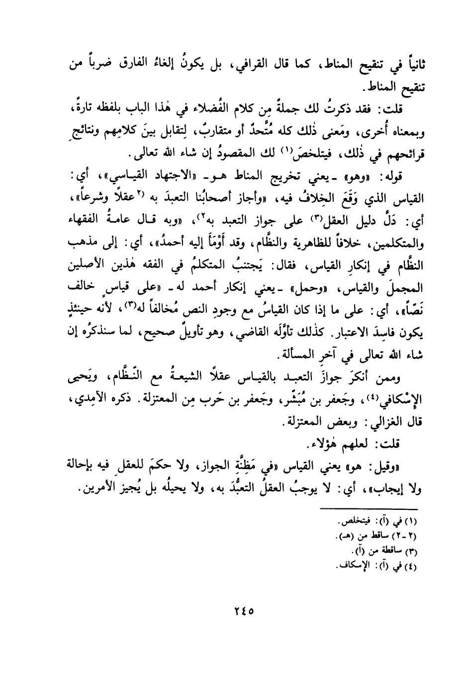 قَوْلُهُ: «وَهُوَ» يَعْنِي تَخْرِيجَ الْمَنَاطِ هُوَ «الِاجْتِهَادُ الْقِيَاسِيُّ» ، أَيِ: الْقِيَاسُ الَّذِي وَقَعَ الْخِلَافُ فِيهِ، «وَأَجَازَ أَصْحَابُنَا التَّعَبُّدَ بِهِ عَقْلًا وشَرْعًا» ، أَيْ: دَلَّ دَلِيلُ الْعَقْلِ عَلَى جَوَازِ التَّعَبُّدِ بِهِ، «وَبِهِ قَالَ عَامَّةُ الْفُقَهَاءِ وَالْمُتَكَلِّمِينَ، خِلَافًا لِلظَّاهِرِيَّةِ وَالنَّظَّامِ، وَقَدْ أَوْمَأَ إِلَيْهِ أَحْمَدُ» ، أَيْ: إِلَى مَذْهَبِ النَّظَّامِ فِي إِنْكَارِ الْقِيَاسِ، فَقَالَ: يَجْتَنِبُ الْمُتَكَلِّمُ فِي الْفِقْهِ هَذَيْنِ الْأَصْلَيْنِ الْمُجْمَلَ وَالْقِيَاسَ، «وَحُمِلَ» يَعْنِي إِنْكَارَ أَحْمَدَ لَهُ «عَلَى قِيَاسٍ خَالَفَ نَصًّا» ، أَيْ: عَلَى مَا إِذَا كَانَ الْقِيَاسُ مَعَ وُجُودِ النَّصِّ مُخَالِفًا لَهُ؛ لِأَنَّهُ حِينَئِذٍ يَكُونُ فَاسِدَ الِاعْتِبَارِ. كَذَلِكَ تَأَوَّلَهُ الْقَاضِي، وَهُوَ تَأْوِيلٌ صَحِيحٌ؛ لِمَا سَنَذْكُرُهُ إِنْ شَاءَ اللَّهُ تَعَالَى فِي آخِرِ الْمَسْأَلَةِ.