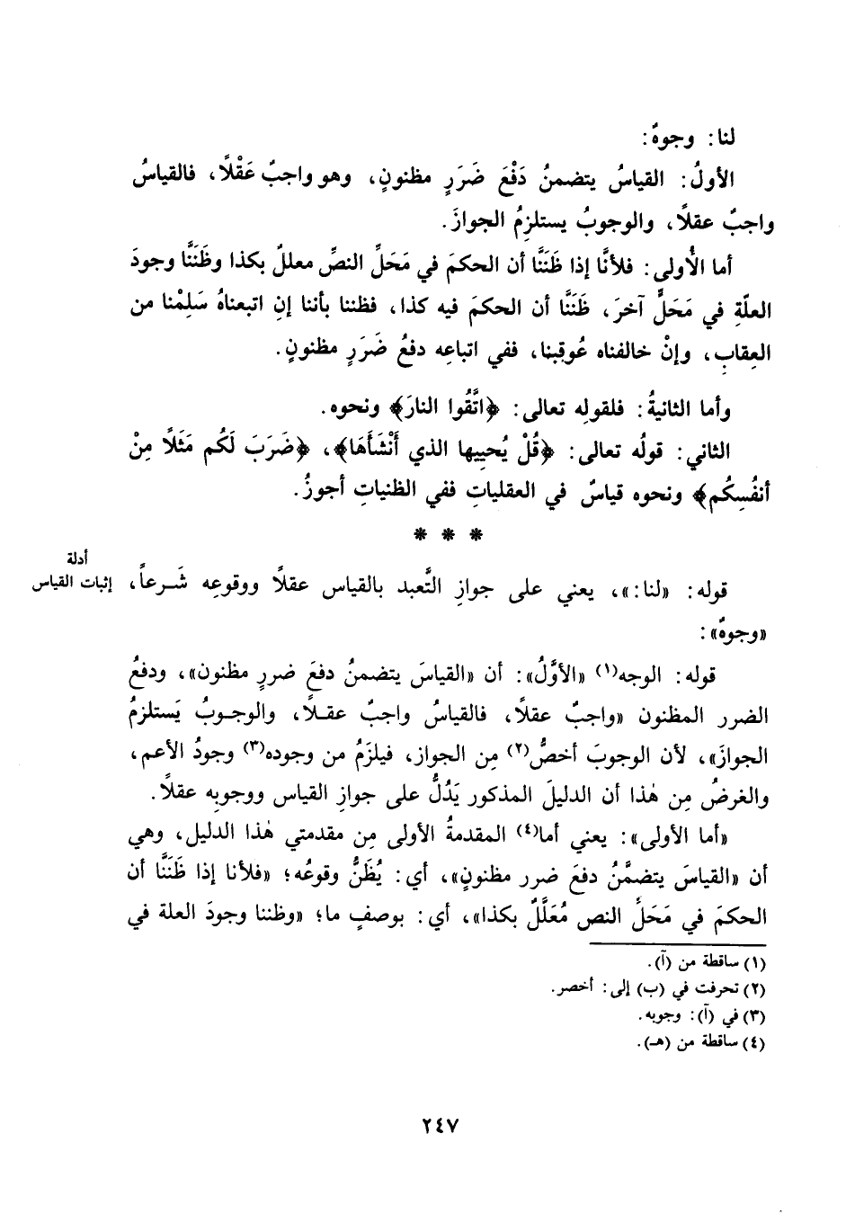 قَوْلُهُ: الْوَجْهُ «الْأَوَّلُ» : أَنَّ «الْقِيَاسَ يَتَضَمَّنُ دَفْعَ ضَرَرٍ مَظْنُونٍ» ، وَدَفْعُ الضَّرَرِ الْمَظْنُونِ «وَاجِبٌ عَقْلًا، فَالْقِيَاسُ وَاجِبٌ عَقْلًا، وَالْوُجُوبُ يَسْتَلْزِمُ الْجَوَازَ» ؛ لِأَنَّ الْوُجُوبَ أَخَصُّ مِنَ الْجَوَازِ، فَيَلْزَمُ مِنْ وُجُودِهِ وُجُودُ الْأَعَمِّ، وَالْغَرَضُ مِنْ هَذَا أَنَّ الدَّلِيلَ الْمَذْكُورَ يَدُلُّ عَلَى جَوَازِ الْقِيَاسِ وَوُجُوبِهِ عَقْلًا.