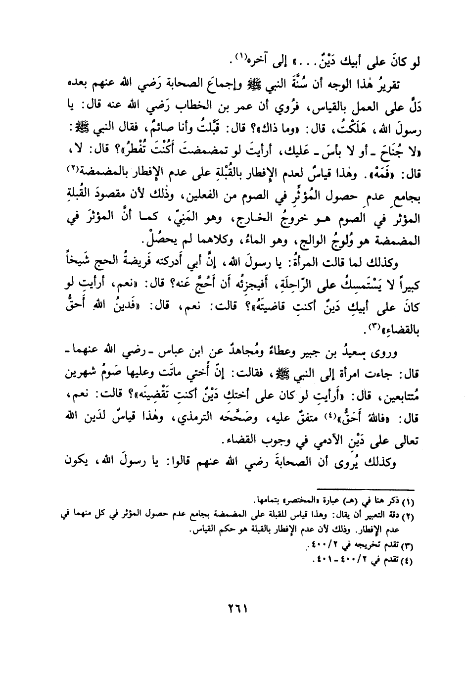 وَرَوَى سَعِيدُ بْنُ جُبَيْرٍ وَعَطَاءٌ وَمُجَاهِدٌ عَنْ ابْنِ عَبَّاسٍ - رَضِيَ اللَّهُ عَنْهُمَا - قَالَ: جَاءَتِ امْرَأَةٌ إِلَى النَّبِيِّ - صَلَّى اللَّهُ عَلَيْهِ وَسَلَّمَ، فَقَالَتْ: إِنَّ أُخْتِي مَاتَتْ وَعَلَيْهَا صَوْمُ شَهْرَيْنِ مُتَتَابِعَيْنِ، قَالَ: أَرَأَيْتِ لَوْ كَانَ عَلَى أُخْتِكِ دَيْنٌ أَكُنْتِ تَقْضِينَهُ؟ قَالَتْ: نَعَمْ، قَالَ: فَاللَّهُ أَحَقُّ مُتَّفَقٌ عَلَيْهِ، وَصَحَّحَهُ التِّرْمِذِيُّ، وَهَذَا قِيَاسٌ لِدَيْنِ اللَّهِ تَعَالَى عَلَى دَيْنِ الْآدَمِيِّ فِي وُجُوبِ الْقَضَاءِ.