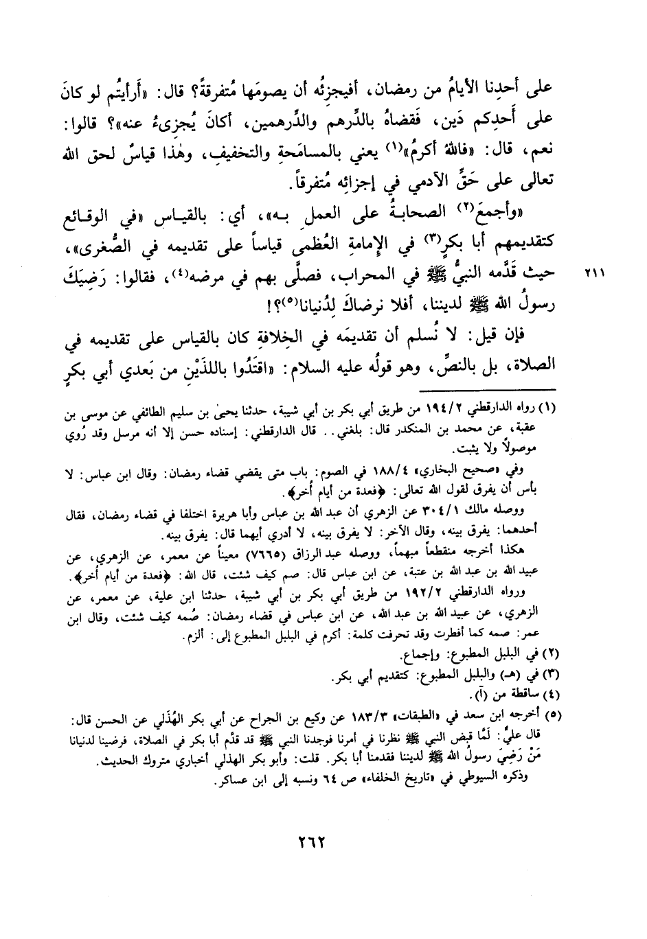 «وَأَجْمَعَ الصَّحَابَةُ عَلَى الْعَمَلِ بِهِ» ، أَيْ: بِالْقِيَاسِ «فِي الْوَقَائِعِ كَتَقْدِيِمِهِمْ أَبَا بَكْرٍ فِي الْإِمَامَةِ الْعُظْمَى قِيَاسًا عَلَى تَقْدِيِمِهِ فِي الصُّغْرَى» ، حَيْثُ قَدَّمَهُ النَّبِيُّ - صَلَّى اللَّهُ عَلَيْهِ وَسَلَّمَ - فِي الْمِحْرَابِ، فَصَلَّى بِهِمْ فِي مَرَضِهِ، فَقَالُوا: رَضِيَكَ رَسُولُ اللَّهِ - صَلَّى اللَّهُ عَلَيْهِ وَسَلَّمَ - لِدِينِنَا، أَفَلَا نَرْضَاكَ لِدُنْيَانَا؟ !