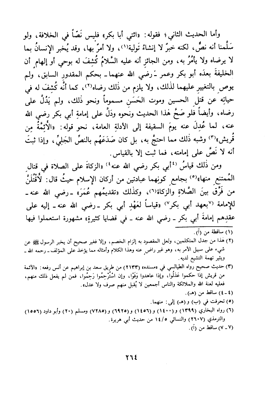 وَأَمَّا الْحَدِيثُ الثَّانِي ; فَقَوْلُهُ: ائْتِي أَبَا بَكْرٍ فَلَيْسَ نَصًّا فِي الْخِلَافَةِ، وَلَوْ سَلَّمْنَا أَنَّهُ نَصٌّ، لَكِنَّهُ خَبَرٌ لَا إِنْشَاءُ تَوْلِيَةٍ، وَلَا أَمْرٌ بِهَا، وَقَدْ يُخْبِرُ الْإِنْسَانُ بِمَا لَا يَرْضَاهُ وَلَا يَأْمُرُ بِهِ، وَمِنَ الْجَائِزِ أَنَّهُ - عَلَيْهِ السَّلَامُ - كُشِفَ لَهُ بِوَحْيٍ أَوْ إِلْهَامٍ أَنَّ الْخَلِيفَةَ بَعْدَهُ أَبُو بَكْرٍ وَعُمَرَ - رَضِيَ اللَّهُ عَنْهُمَا - بِحُكْمِ الْمَقْدُورِ السَّابِقِ، وَلَمْ يُوصِ بِالتَّغْيِيرِ عَلَيْهِمَا بِذَلِكَ، وَلَا يَلْزَمْ مِنْ ذَلِكَ رِضَاهُ، كَمَا أَنَّهُ كُشِفَ لَهُ فِي حَيَاتِهِ عَنْ قَتْلِ الْحُسَيْنِ وَمَوْتِ الْحَسَنِ مَسْمُومًا وَنَحْوِ ذَلِكَ، وَلَمْ يَدُلَّ عَلَى رِضَاهُ، وأَيْضًا فَلَوْ صَحَّ هَذَا الْحَدِيثُ وَنَحْوُهُ وَدَلَّ عَلَى إِمَامَةِ أَبِي بَكْرٍ - رَضِيَ اللَّهُ عَنْهُ، لَمَا عَدَلَ عَنْهُ يَوْمَ السَّقِيفَةِ إِلَى الْأَدِلَّةِ الْعَامَّةِ، نَحْوِ قَوْلِهِ: «الْأَئِمَّةُ مِنْ قُرَيْشٍ» وَشِبْهِ ذَلِكَ مِمَّا احْتَجَّ بِهِ، بَلْ كَانَ صَدَعَهُمْ بِالنَّصِّ الْجَلِيِّ، وَإِذَا ثَبَتَ أَنَّهُ لَا نَصَّ عَلَى إِمَامَتِهِ، فَمَا ثَبَتَ إِلَّا بِالْقِيَاسِ.