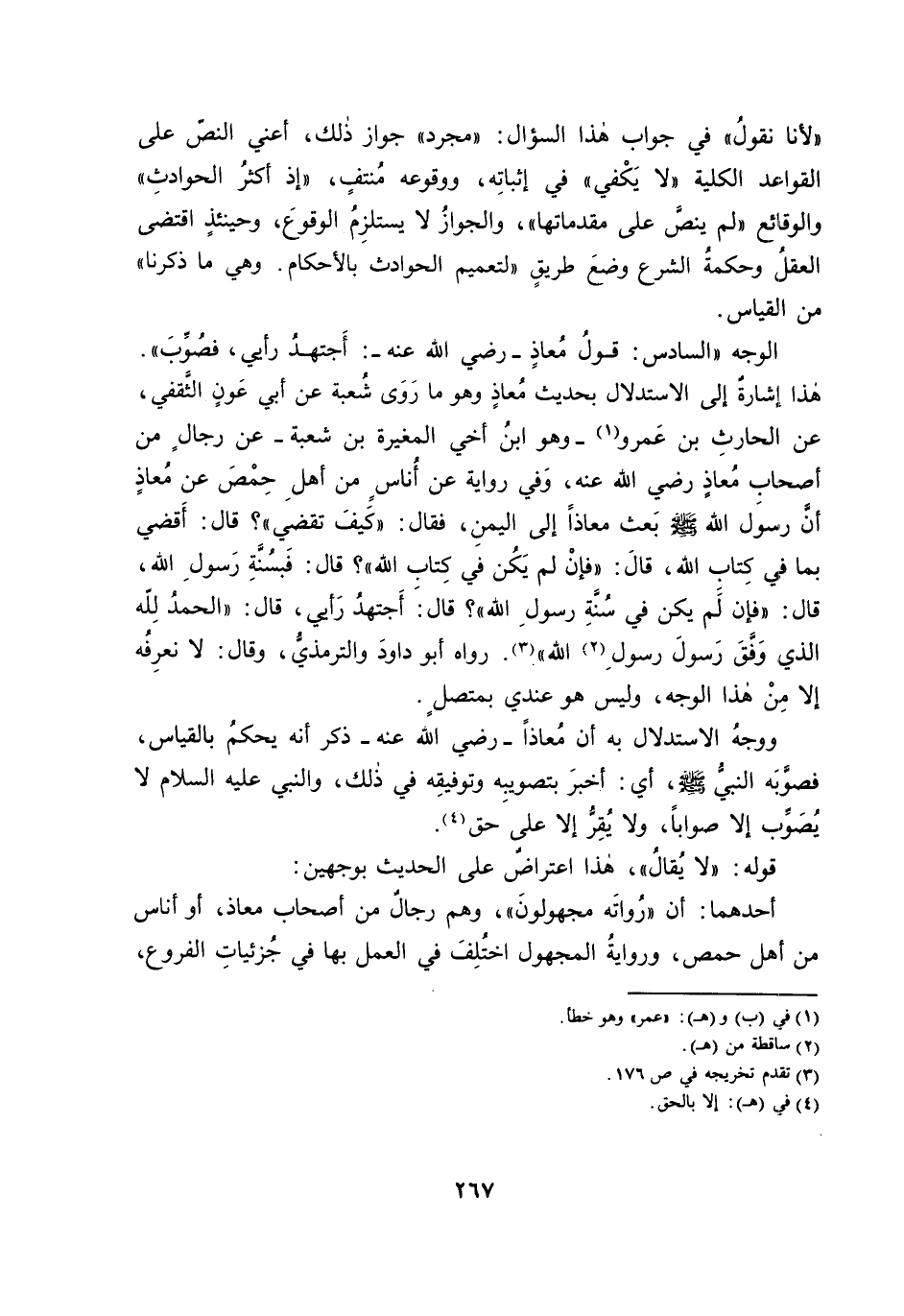 هَذَا إِشَارَةٌ إِلَى الِاسْتِدْلَالِ بِحَدِيثِ مُعَاذٍ وَهُوَ مَا رَوَى شُعْبَةُ عَنْ أَبِي عَوْنٍ الثَّقَفِيِّ، عَنِ الْحَارِثِ بْنِ عَمْرٍو وَهُوَ ابْنُ أَخِي الْمُغِيرَةِ بْنِ شُعْبَةٍ عَنْ رِجَالٍ مِنْ أَصْحَابِ مُعَاذٍ - رَضِيَ اللَّهُ عَنْهُ -، وَفِي رِوَايَةٍ عَنْ أُنَاسٍ مِنْ أَهْلِ حِمْصَ عَنْ مُعَاذٍ أَنَّ رَسُولَ اللَّهِ - صَلَّى اللَّهُ عَلَيْهِ وَسَلَّمَ - بَعَثَ مُعَاذًا إِلَى الْيَمَنِ، فَقَالَ: كَيْفَ تَقْضِي؟ قَالَ: أَقْضِي بِمَا فِي كِتَابِ اللَّهِ قَالَ: فَإِنْ لَمْ يَكُنْ فِي كِتَابِ اللَّهِ؟ قَالَ: فَبِسُنَّةِ رَسُولِ اللَّهِ، قَالَ: فَإِنْ لَمْ يَكُنْ فِي سُنَّةِ رَسُولِ اللَّهِ؟ قَالَ: أَجْتَهِدُ رَأْيِي، قَالَ: الْحَمْدُ لِلَّهِ الَّذِي وَفَّقَ رَسُولَ رَسُولِ اللَّهِ. رَوَاهُ أَبُو دَاوُدَ وَالتِّرْمِذِيُّ، وَقَالَ: لَا نَعْرِفْهُ إِلَّا مِنْ هَذَا الْوَجْهِ، وَلَيْسَ هُوَ عِنْدِي بِمُتَّصِلٍ.