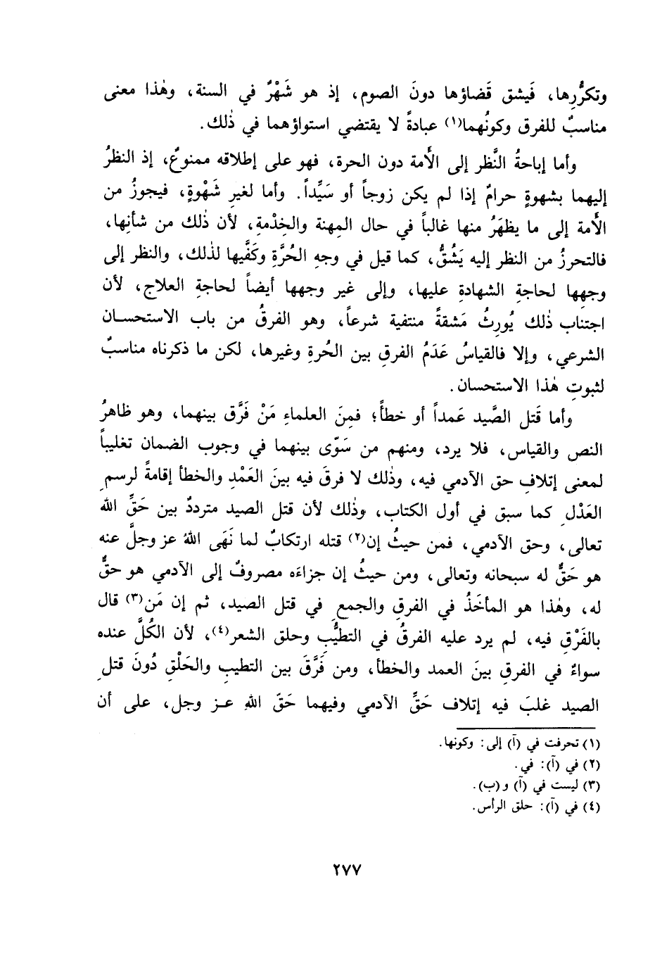 وَأَمَّا قَتْلُ الصَّيْدِ عَمْدًا أَوْ خَطَأً ; فَمِنَ الْعُلَمَاءِ مَنْ فَرَّقَ بَيْنَهُمَا، وَهُوَ ظَاهِرُ النَّصِّ وَالْقِيَاسِ، فَلَا يُرَدُّ، وَمِنْهُمْ مَنْ سَوَّى بَيْنِهِمَا فِي وُجُوبِ الضَّمَانِ تَغْلِيبًا لِمَعْنَى إِتْلَافِ حَقِّ الْآدَمِيِّ فِيهِ، وَذَلِكَ لَا فَرْقَ فِيهِ بَيْنَ الْعَمْدِ وَالْخَطَأِ إِقَامَةً لِرَسْمِ الْعَدْلِ كَمَا سَبَقَ فِي أَوَّلِ الْكِتَابِ، وَذَلِكَ لِأَنَّ قَتْلَ الصَّيْدِ مُتَرَدِّدٌ بَيْنَ حَقِّ اللَّهِ تَعَالَى، وَحَقِّ الْآدَمِيِّ، فَمِنْ حَيْثُ إِنَّ قَتْلَهُ ارْتِكَابٌ لِمَا نَهَى اللَّهُ - عَزَّ وَجَلَّ - عَنْهُ هُوَ حَقُّ لَهُ - سُبْحَانَهُ وَتَعَالَى، وَمِنْ حَيْثُ إِنَّ جَزَاءَهُ مَصْرُوفٌ إِلَى الْآدَمِيِّ هُوَ حَقٌّ لَهُ، وَهَذَا هُوَ الْمَأْخَذُ فِي الْفَرْقِ وَالْجَمْعِ فِي قَتْلِ الصَّيْدِ، ثُمَّ إِنَّ مَنْ قَالَ بِالْفَرْقِ فِيهِ، لَمْ يَرِدْ عَلَيْهِ الْفَرْقُ فِي التَّطَيُّبِ وَحَلْقِ الشَّعْرِ؛ لِأَنَّ الْكُلَّ عِنْدَهُ سَوَاءٌ فِي الْفَرْقِ بَيْنَ الْعَمْدِ وَالْخَطَأِ، وَمَنْ فَرَّقَ بَيْنَ التَّطَيُّبِ وَالْحَلْقِ دُونَ قَتْلِ الصَّيْدِ غَلَبَ فِيهِ إِتْلَافُ حَقِّ الْآدَمِيِّ وَفِيهِمَا حَقُّ اللَّهِ - عَزَّ وَجَلَّ -، عَلَى أَنَّ