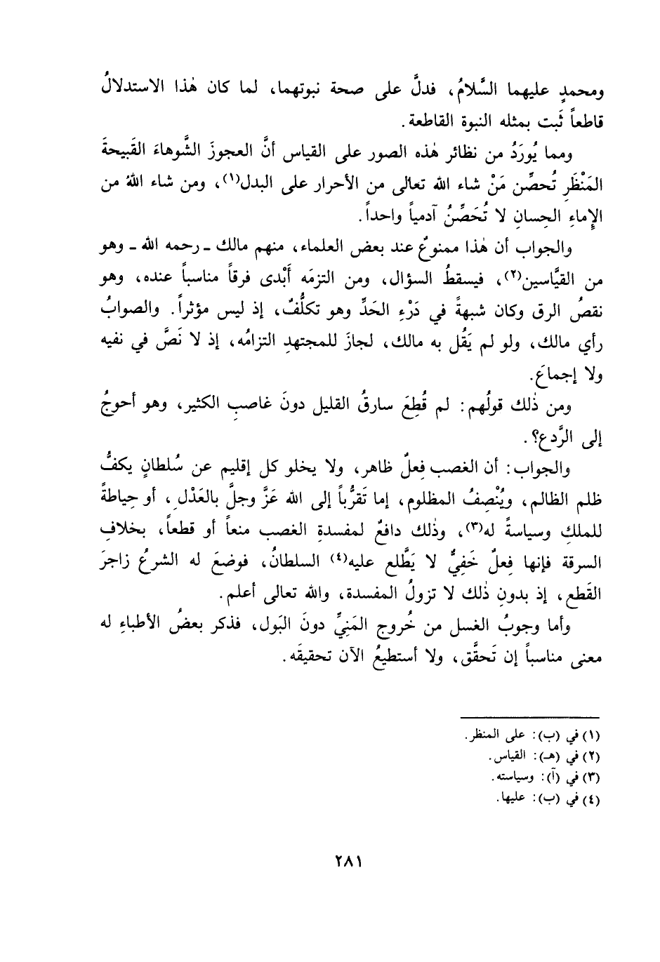 وَالْجَوَابُ أَنَّ هَذَا مَمْنُوعٌ عِنْدَ بَعْضِ الْعُلَمَاءِ، مِنْهُمْ مَالِكٌ - رَحِمَهُ اللَّهُ - وَهُوَ مِنَ الْقَيَّاسِينَ، فَيَسْقُطُ السُّؤَالُ، وَمَنِ الْتَزَمَهُ أَبْدَى فَرْقًا مُنَاسِبًا عِنْدَهُ، وَهُوَ نَقْصُ الرِّقِّ وَكَانَ شُبْهَةً فِي دَرْءِ الْحَدِّ وَهُوَ تَكَلُّفٌ، إِذْ لَيْسَ مُؤَثِّرًا، وَالصَّوَابُ رَأْيُ مَالِكٍ، وَلَوْ لَمْ يَقُلْ بِهِ مَالِكٌ، لِجَازَ لِلْمُجْتَهِدِ الْتِزَامُهُ، إِذْ لَا نَصَّ فِي نَفْيِهِ وَلَا إِجْمَاعَ.