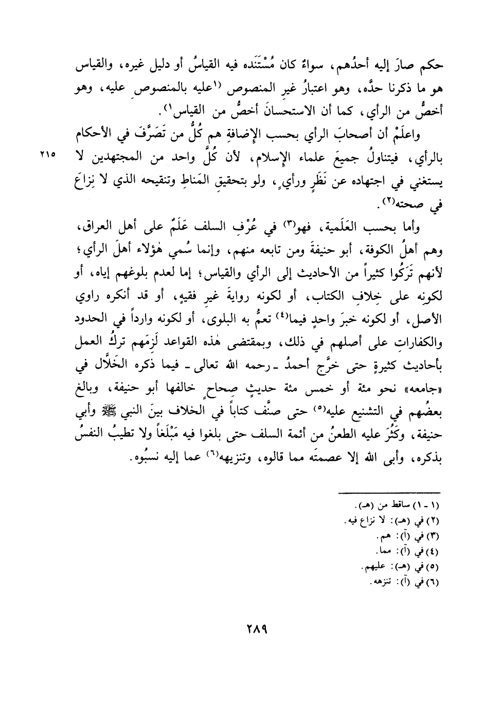 وَاعْلَمْ أَنَّ أَصْحَابَ الرَّأْيِ بِحَسَبِ الْإِضَافَةِ هُمْ كُلُّ مَنْ تَصَرَّفَ فِي الْأَحْكَامِ بِالرَّأْيِ، فَيَتَنَاوَلُ جَمِيعَ عُلَمَاءِ الْإِسْلَامِ؛ لِأَنَّ كُلَّ وَاحِدٍ مِنَ الْمُجْتَهِدِينَ لَا يَسْتَغْنِي فِي اجْتِهَادِهِ عَنْ نَظَرٍ وَرَأْيٍ، وَلَوْ بِتَحْقِيقِ الْمَنَاطِ وَتَنْقِيحِهِ الَّذِي لَا نِزَاعَ فِي صِحَّتِهِ.
