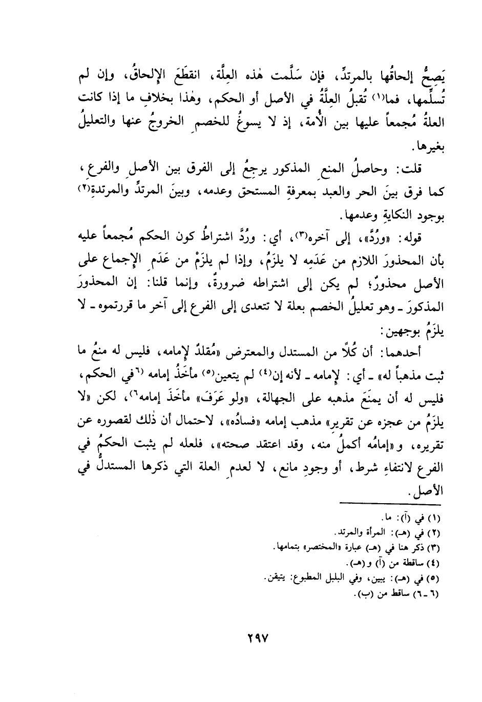 يَصِحُّ إِلْحَاقُهَا بِالْمُرْتَدِّ، فَإِنَّ سَلَّمْتَ هَذِهِ الْعِلَّةَ، انْقَطَعَ الْإِلْحَاقُ، وَإِنْ لَمْ تُسَلِّمْهَا، فَمَا تُقْبَلُ الْعِلَّةُ فِي الْأَصْلِ أَوِ الْحُكْمِ، وَهَذَا بِخِلَافِ مَا إِذَا كَانَتِ الْعِلَّةُ مُجْمَعًا عَلَيْهَا بَيْنَ الْأُمَّةِ، إِذْ لَا يَسُوغُ لِلْخَصْمِ الْخُرُوجُ عَنْهَا وَالتَّعْلِيلُ بِغَيْرِهَا.