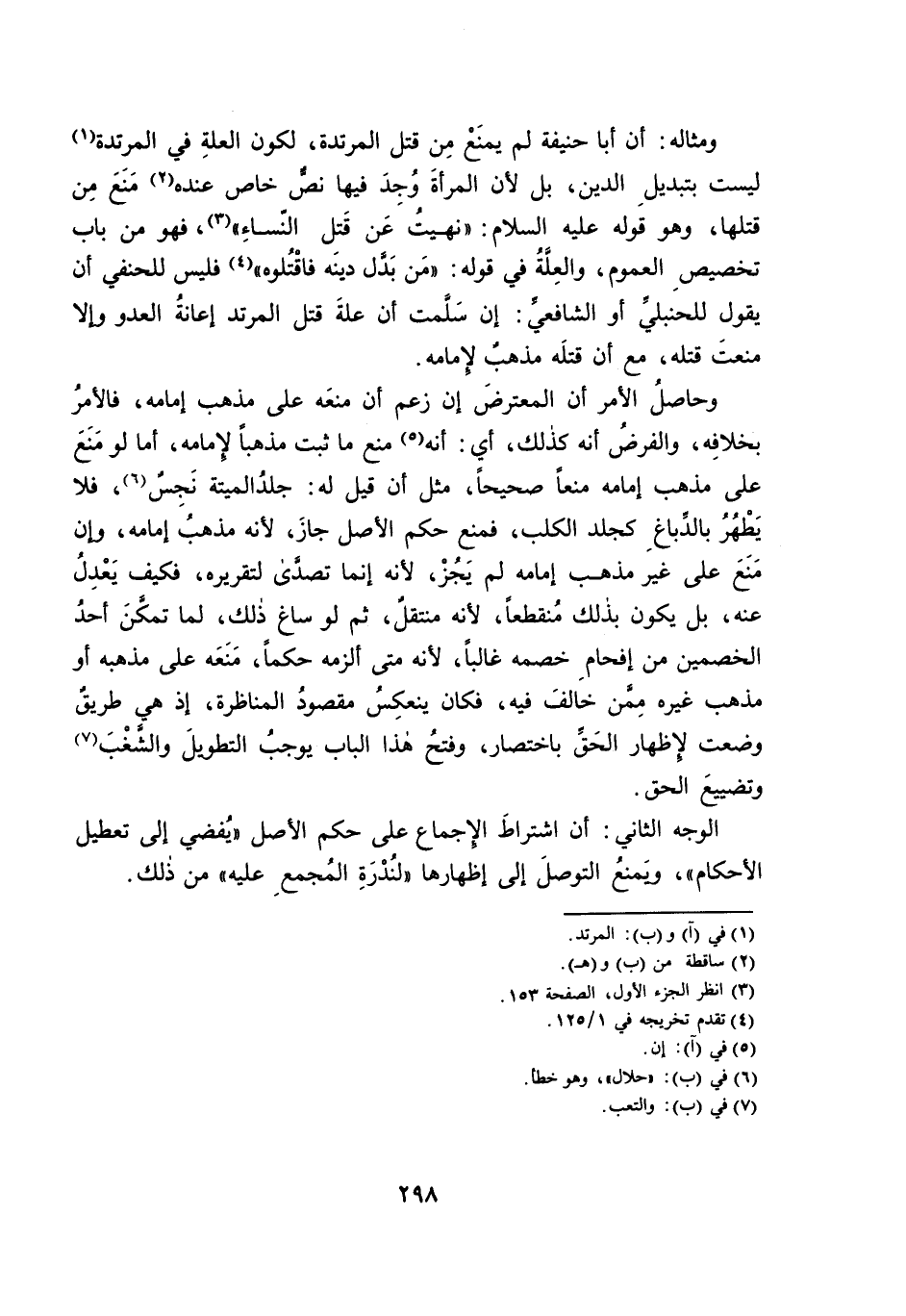 وَمِثَالُهُ: أَنَّ أَبَا حَنِيفَةَ لَمْ يَمْنَعْ مِنْ قَتْلِ الْمُرْتَدَّةِ؛ لِكَوْنِ الْعِلَّةِ فِي الْمُرْتَدَّةِ لَيْسَتْ بِتَبْدِيلِ الدِّينِ، بَلْ لِأَنَّ الْمَرْأَةَ وُجِدَ فِيهَا نَصٌّ خَاصٌّ عِنْدَهُ مَنَعَ مِنْ قَتْلِهَا، وَهُوَ قَوْلُهُ - عَلَيْهِ السَّلَامُ: نُهِيتُ عَنْ قَتْلِ النِّسَاءِ، فَهُوَ مِنْ بَابِ تَخْصِيصِ الْعُمُومِ، وَالْعِلَّةُ فِي قَوْلِهِ: مَنْ بَدَّلَ دِينَهُ فَاقْتُلُوهُ فَلَيْسَ لِلْحَنَفِيِّ أَنْ يَقُولَ لِلْحَنْبَلِيِّ أَوِ الشَّافِعِيِّ: إِنْ سَلَّمْتَ أَنَّ عِلَّةَ قَتْلِ الْمُرْتَدِّ إِعَانَةُ الْعَدُوِّ وَإِلَّا مَنَعْتَ قَتْلَهُ، مَعَ أَنَّ قَتْلَهُ مَذْهَبٌ لِإِمَامِهِ.