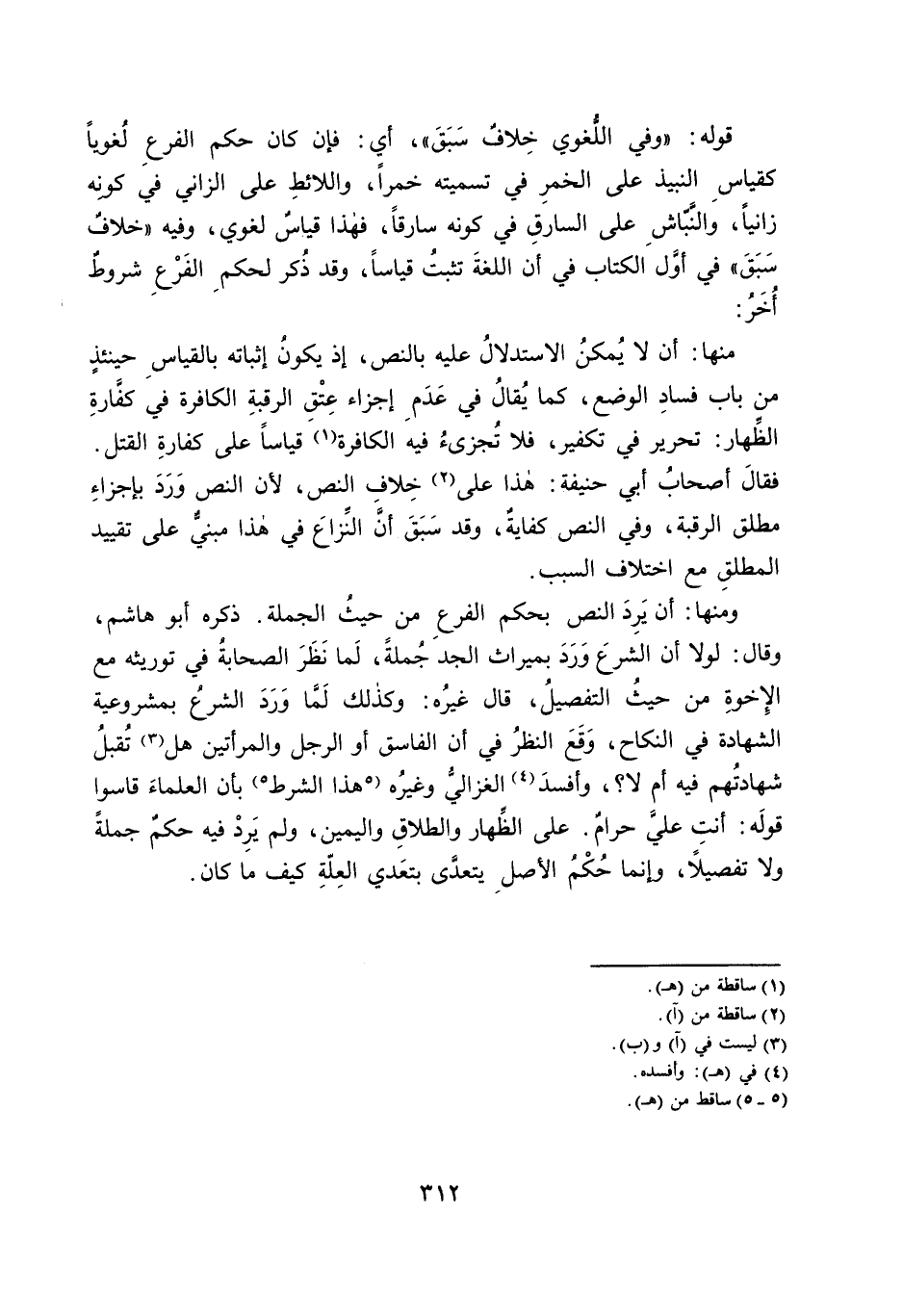 وَمِنْهَا: أَنْ يَرِدَ النَّصُّ بِحُكْمِ الْفَرْعِ مِنْ حَيْثُ الْجُمْلَةُ. ذَكَرَهُ أَبُو هَاشِمٍ، وَقَالَ: لَوْلَا أَنَّ الشَّرْعَ وَرَدَ بِمِيرَاثِ الْجَدِّ جُمْلَةً، لَمَا نَظَرَ الصَّحَابَةُ فِي تَوْرِيثِهِ مَعَ الْإِخْوَةِ مِنْ حَيْثُ التَّفْصِيلُ، قَالَ غَيْرُهُ: وَكَذَلِكَ لَمَّا وَرَدَ الشَّرْعُ بِمَشْرُوعِيَّةِ الشَّهَادَةِ فِي النِّكَاحِ، وَقَعَ النَّظَرُ فِي أَنَّ الْفَاسِقَ أَوِ الرَّجُلَ وَالْمَرْأَتَيْنِ هَلْ تُقْبَلُ شَهَادَتُهُمْ فِيهِ أَمْ لَا؟ وَأَفْسَدَ الْغَزَالِيُّ وَغَيْرُهُ هَذَا الشَّرْطَ بِأَنَّ الْعُلَمَاءَ قَاسُوا قَوْلَهُ: أَنْتِ عَلَيَّ حَرَامٌ. عَلَى الظِّهَارِ وَالطَّلَاقِ وَالْيَمِينِ، وَلَمْ يَرِدْ فِيهِ حُكْمٌ جُمْلَةً وَلَا تَفْصِيلًا، وَإِنَّمَا حُكْمُ الْأَصْلِ يَتَعَدَّى الْعِلَّةَ كَيْفَ مَا كَانَ.
