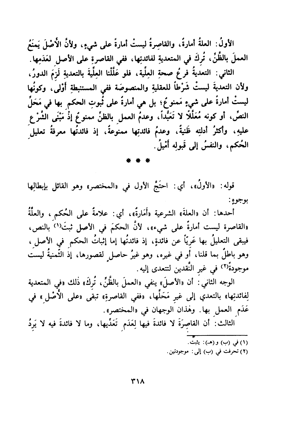 الْأَوَّلُ: الْعِلَّةُ أَمَارَةٌ، وَالْقَاصِرَةُ لَيْسَتْ أَمَارَةً عَلَى شَيْءٍ؛ وَلِأَنَّ الْأَصْلَ يَمْنَعُ الْعَمَلَ بِالظَّنِّ، تُرِكَ فِي الْمُتَعَدِّيَةِ لِفَائِدَتِهَا، فَفِي الْقَاصِرَةِ عَلَى الْأَصْلِ لِعَدَمِهَا.