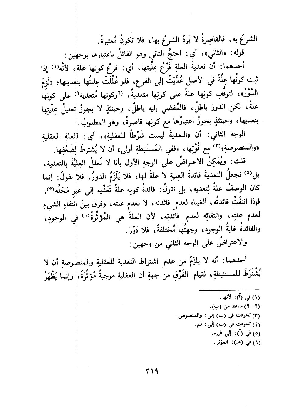 قُلْتُ: وَيُمْكِنُ الِاعْتِرَاضُ عَلَى الْوَجْهِ الْأَوَّلِ بِأَنَّا لَا نُعَلِّلُ الْعِلِّيَّةَ بِالتَّعْدِيَةِ، بَلْ نَجْعَلُ التَّعْدِيَةَ فَائِدَةَ الْعِلِّيَّةِ لَا عِلَّةً لَهَا، فَلَا يَلْزَمُ الدَّوْرُ، فَلَا نَقُولُ: إِنَّمَا كَانَ الْوَصْفُ عِلَّةً لِتَعَدِّيِهِ، بَلْ نَقُولُ: فَائِدَةُ كَوْنِهِ عِلَّةً تَعَدِّيهِ إِلَى غَيْرِ مَحَلِّهِ، فَإِذَا انْتَفَتْ فَائِدَتُهُ، أَلْغَيْنَاهُ لِعَدَمِ فَائِدَتِهِ، لَا لِعَدَمِ عِلَّتِهِ، وَفَرْقٌ بَيْنَ انْتِفَاءِ الشَّيْءِ لِعَدَمِ عِلَّتِهِ، وَانْتِفَائِهِ لِعَدَمِ فَائِدَتِهِ؛ لِأَنَّ الْعِلَّةَ هِيَ الْمُؤَثِّرَةُ فِي الْوُجُودِ، وَالْفَائِدَةُ غَايَةُ الْوُجُودِ، وَجِهَتُهَا مُخْتَلِفَةٌ، فَلَا دَوْرَ.
