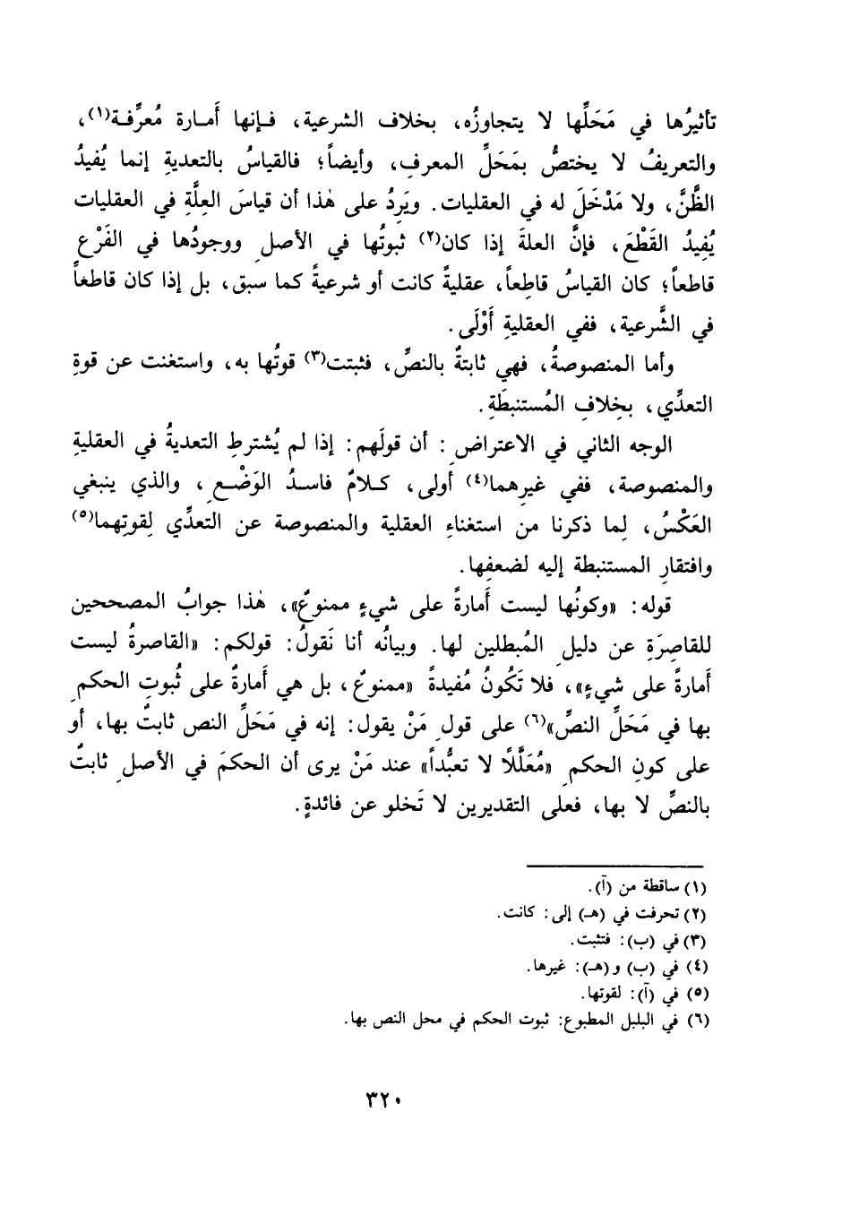 قَوْلُهُ: «وَكَوْنُهَا لَيْسَتْ أَمَارَةً عَلَى شَيْءٍ مَمْنُوعٌ» ، هَذَا جَوَابُ الْمُصَحِّحِينَ لِلْقَاصِرَةِ عَنْ دَلِيلِ الْمُبْطِلِينَ لَهَا. وَبَيَانُهُ أَنَّا نَقُولُ: قَوْلُكُمْ: «الْقَاصِرَةُ لَيْسَتْ أَمَارَةً عَلَى شَيْءٍ» ، فَلَا تَكُونُ مُفِيدَةً «مَمْنُوعٌ، بَلْ هِيَ أَمَارَةٌ عَلَى ثُبُوتِ الْحُكْمِ بِهَا فِي مَحَلِّ النَّصِّ» عَلَى قَوْلِ مَنْ يَقُولُ: إِنَّهُ فِي مَحَلِّ النَّصِّ ثَابِتٌ بِهَا، أَوْ عَلَى كَوْنِ الْحُكْمِ «مُعَلَّلًا لَا تَعَبُّدًا» عِنْدَ مَنْ يَرَى أَنَّ الْحُكْمَ فِي الْأَصْلِ ثَابِتٌ بِالنَّصِّ لَا بِهَا، فَعَلَى التَّقْدِيرَيْنِ لَا تَخْلُو عَنْ فَائِدَةٍ.