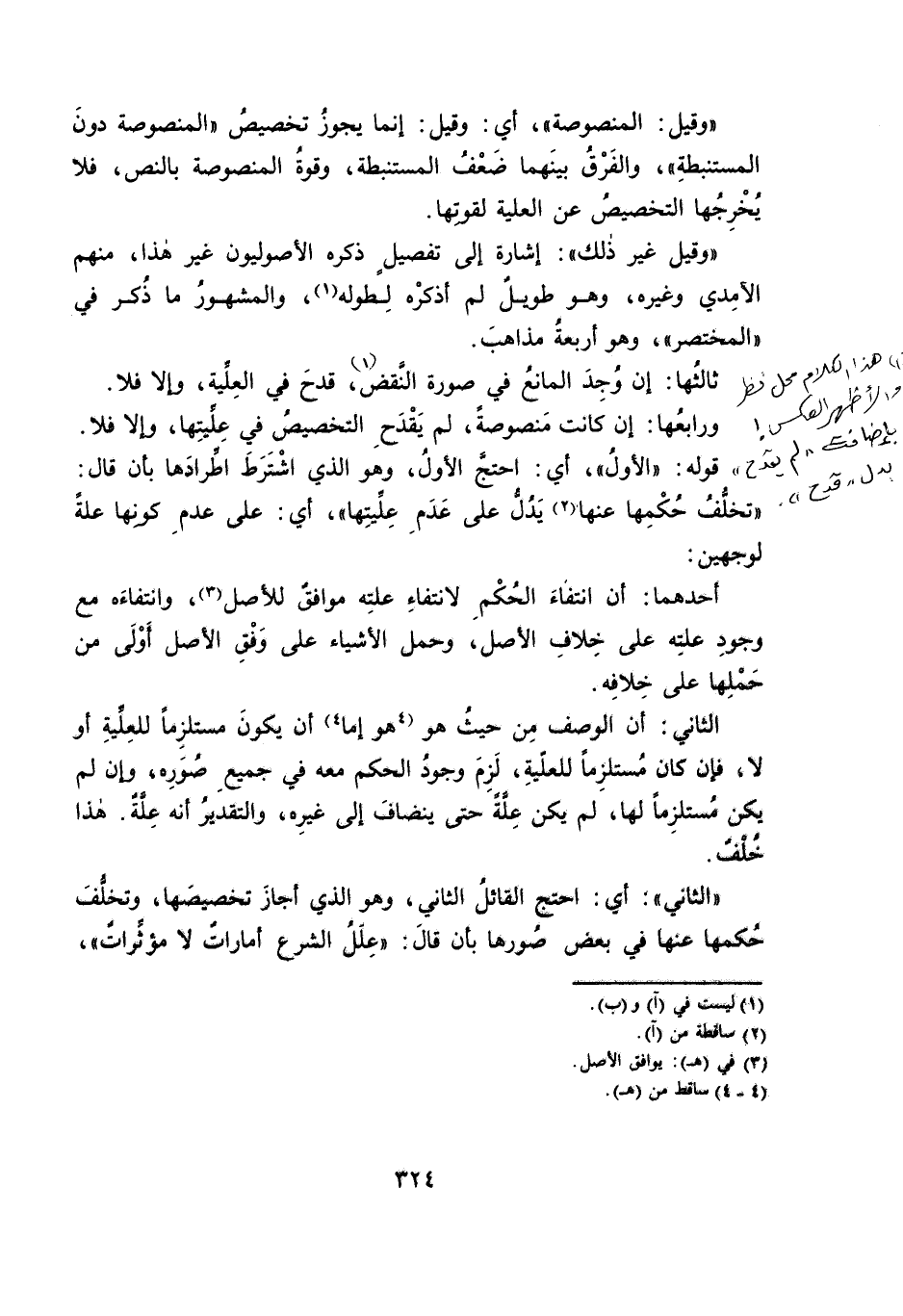 «وَقِيلَ: الْمَنْصُوصَةُ» أَيْ: وَقِيلَ: إِنَّمَا يَجُوزُ تَخْصِيصُ «الْمَنْصُوصَةِ دُونَ الْمُسْتَنْبَطَةِ» وَالْفَرْقُ بَيْنَهُمَا ضَعْفُ الْمُسْتَنْبَطَةِ، وَقُوَّةُ الْمَنْصُوصَةِ بِالنَّصِّ، فَلَا يُخْرِجُهَا التَّخْصِيصُ عَنِ الْعِلِّيَّةِ لِقُوَّتِهَا.