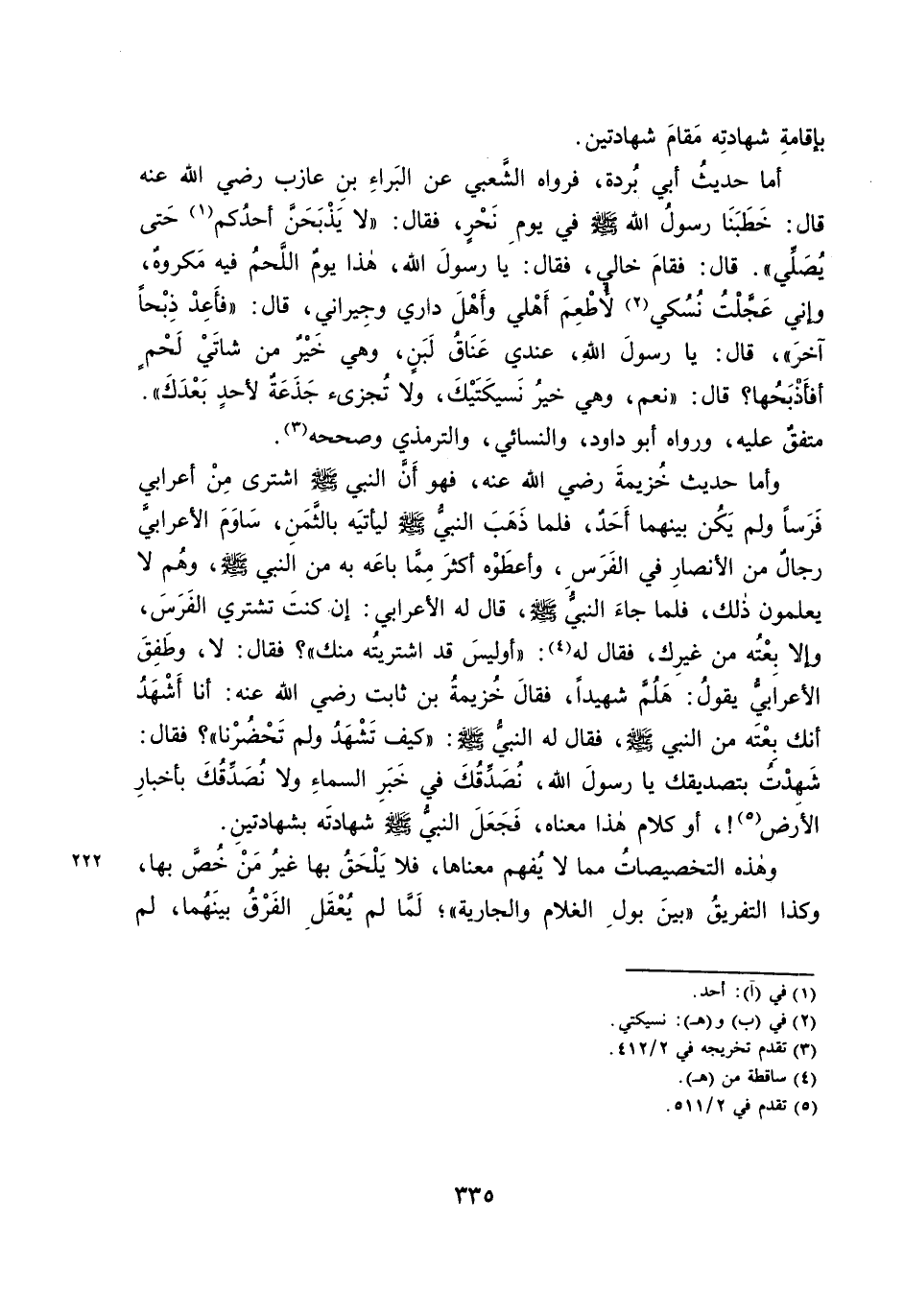 وَأَمَّا حَدِيثُ خُزَيْمَةَ - رَضِيَ اللَّهُ عَنْهُ -، فَهُوَ أَنَّ النَّبِيَّ - صَلَّى اللَّهُ عَلَيْهِ وَسَلَّمَ - اشْتَرَى مِنْ أَعْرَابِيٍّ فَرَسًا وَلَمْ يَكُنْ بَيْنَهُمَا أَحَدٌ، فَلَمَّا ذَهَبَ النَّبِيُّ - صَلَّى اللَّهُ عَلَيْهِ وَسَلَّمَ - لِيَأْتِيَهُ بِالثَّمَنِ، سَاوَمَ الْأَعْرَابِيَّ رِجَالٌ مِنَ الْأَنْصَارِ فِي الْفَرَسِ، وَأَعْطَوْهُ أَكْثَرَ مِمَّا بَاعَهُ بِهِ مِنَ النَّبِيِّ - صَلَّى اللَّهُ عَلَيْهِ وَسَلَّمَ -، وَهُمْ لَا يَعْلَمُونَ ذَلِكَ، فَلَمَّا جَاءَ النَّبِيُّ - صَلَّى اللَّهُ عَلَيْهِ وَسَلَّمَ -، قَالَ لَهُ الْأَعْرَابِيُّ: إِنْ كُنْتَ تَشْتَرِي الْفَرَسَ، وَإِلَّا بِعْتُهُ مِنْ غَيْرِكَ، فَقَالَ لَهُ: أَوَلَيِسَ قَدِ اشْتَرَيْتُهُ مِنْكَ؟ فَقَالَ: لَا، وَطَفِقَ الْأَعْرَابِيُّ يَقُولُ: هَلُمَّ شَهِيدًا، فَقَالَ خُزَيْمَةُ بْنُ ثَابِتٍ - رَضِيَ اللَّهُ عَنْهُ -: أَنَا أَشْهَدُ أَنَّكَ بِعْتَهُ مِنَ النَّبِيِّ - صَلَّى اللَّهُ عَلَيْهِ وَسَلَّمَ -، فَقَالَ لَهُ النَّبِيُّ - صَلَّى اللَّهُ عَلَيْهِ وَسَلَّمَ -: كَيْفَ تَشْهَدُ وَلَمْ تَحْضُرْنَا؟ فَقَالَ: شَهِدْتُ بِتَصْدِيقِكَ يَا رَسُولَ اللَّهِ، نُصَدِّقُكَ فِي خَبَرِ السَّمَاءِ وَلَا نُصَدِّقُكَ بِأَخْبَارِ الْأَرْضِ! ، أَوْ كَلَامٌ هَذَا مَعْنَاهُ، فَجَعَلَ النَّبِيُّ - صَلَّى اللَّهُ عَلَيْهِ وَسَلَّمَ - شَهَادَتَهُ بِشَهَادَتَيْنِ.
