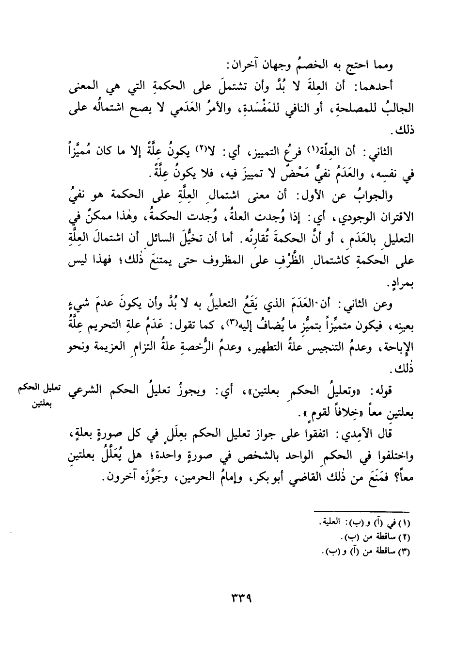 قَالَ الْآمِدِيُّ: اتَّفَقُوا عَلَى جَوَازِ تَعْلِيلِ الْحُكْمِ بِعِلَلٍ فِي كُلِّ صُورَةٍ بِعِلَّةٍ، وَاخْتَلَفُوا فِي الْحُكْمِ الْوَاحِدِ بِالشَّخْصِ فِي صُورَةٍ وَاحِدَةٍ; هَلْ يُعَلَّلُ بِعِلَّتَيْنِ مَعًا؟ فَمَنَعَ مِنْ ذَلِكَ الْقَاضِي أَبُو بَكْرٍ، وَإِمَامُ الْحَرَمَيْنِ، وَجَوَّزَهُ آخَرُونَ.