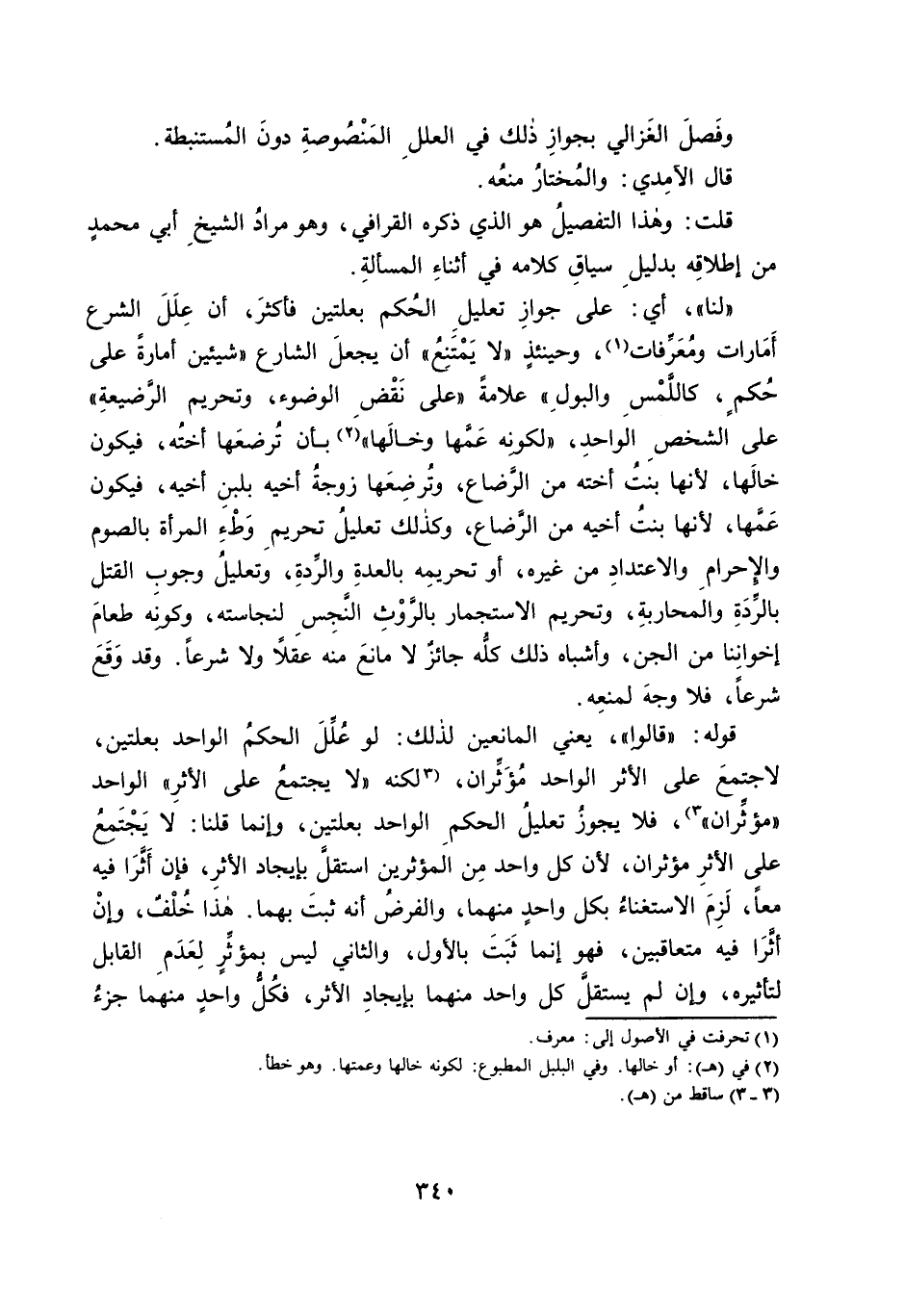 «لَنَا» أَيْ: عَلَى جَوَازِ تَعْلِيلِ الْحُكْمِ بِعِلَّتَيْنِ فَأَكْثَرَ، أَنَّ عِلَلَ الشَّرْعِ أَمَارَاتٌ وَمُعَرِّفَاتٌ، وَحِينَئِذٍ «لَا يَمْتَنِعُ» أَنْ يَجْعَلَ الشَّارِعُ «شَيْئَيْنِ أَمَارَةً عَلَى حُكْمٍ، كَاللَّمْسِ وَالْبَوْلِ» عَلَامَةً «عَلَى نَقْضِ الْوُضُوءِ، وَتَحْرِيمِ الرَّضِيعَةِ» عَلَى الشَّخْصِ الْوَاحِدِ، «لِكَوْنِهِ عَمَّهَا وَخَالَهَا» بِأَنْ تُرْضِعَهَا أُخْتُهُ، فَيَكُونُ خَالَهَا، لِأَنَّهَا بِنْتُ أُخْتِهِ مِنَ الرَّضَاعِ، وَتُرْضِعُهَا زَوْجَةُ أَخِيهِ بِلَبَنِ أَخِيهِ، فَيَكُونُ عَمَّهَا، لِأَنَّهَا بِنْتُ أَخِيهِ مِنَ الرَّضَاعِ، وَكَذَلِكَ تَعْلِيلُ تَحْرِيمِ وَطْءِ الْمَرْأَةِ بِالصَّوْمِ وَالْإِحْرَامِ وَالِاعْتِدَادِ مِنْ غَيْرِهِ، أَوْ تَحْرِيمِهِ بِالْعِدَّةِ وَالرِّدَّةِ، وَتَعْلِيلُ وُجُوبِ الْقَتْلِ بِالرِّدَّةِ وَالْمُحَارَبَةِ، وَتَحْرِيمُ الِاسْتِجْمَارِ بِالرَّوْثِ النَّجِسِ لِنَجَاسَتِهِ، وَكَوْنِهِ طَعَامَ إِخْوَانِنَا مِنَ الْجِنِّ، وَأَشْبَاهُ ذَلِكَ كُلُّهُ جَائِزٌ لَا مَانِعَ مِنْهُ عَقْلًا وَلَا شَرْعًا. وَقَدْ وَقَعَ شَرْعًا، فَلَا وَجْهَ لِمَنْعِهِ.