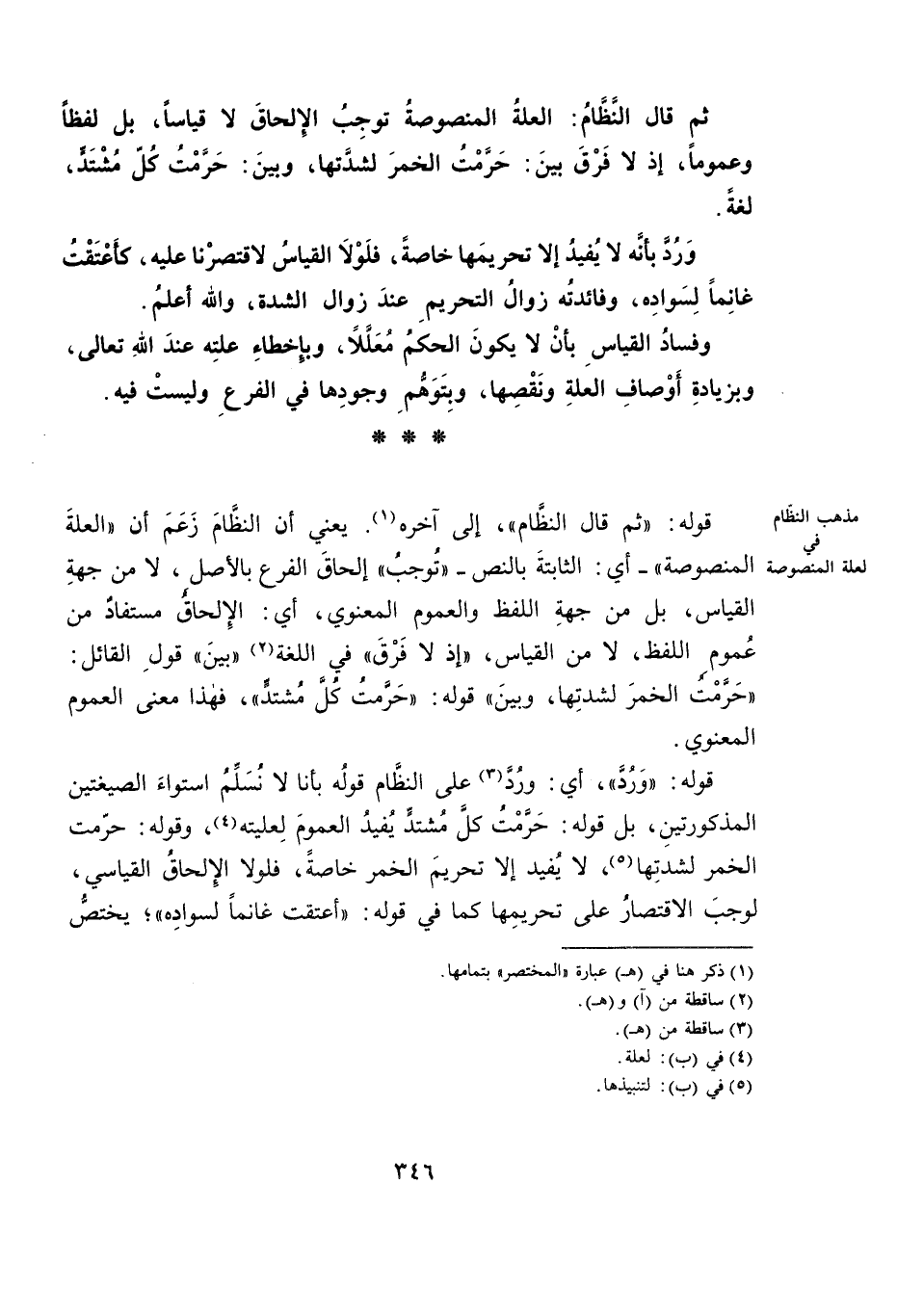 ثُمَّ قَالَ النَّظَّامُ: الْعِلَّةُ الْمَنْصُوصَةُ تُوجِبُ الْإِلْحَاقَ لَا قِيَاسًا بَلْ لَفْظًا وَعُمُومًا، إِذْ لَا فَرْقَ بَيْنَ: حَرَّمْتُ الْخَمْرَ لِشِدَّتِهَا، وَبَيْنَ: حَرَّمْتُ كُلَّ مُشْتَدٍّ، لُغَةً.