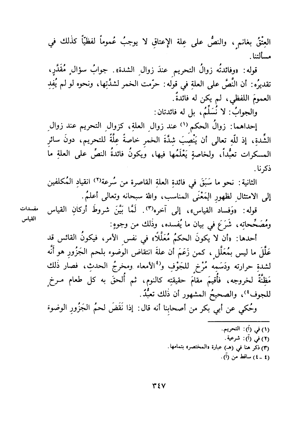 أَحَدُهَا: «أَنْ لَا يَكُونَ الْحُكْمُ مُعَلَّلًا» فِي نَفْسِ الْأَمْرِ، فَيَكُونُ الْقَائِسُ قَدْ عَلَّلَ مَا لَيْسَ بِمُعَلَّلٍ، كَمَنْ زَعَمَ أَنَّ عِلَّةَ انْتِقَاضِ الْوُضُوءِ بِلَحْمِ الْجَزُورِ هُوَ أَنَّهُ لِشِدَّةِ حَرَارَتِهِ وَدَسَمِهِ مُرْخٍ لِلْجَوْفِ وَالْأَمْعَاءِ وَمَخْرِجُ الْحَدَثِ، فَصَارَ ذَلِكَ مَظِنَّةً لِخُرُوجِهِ، فَأُقِيمَ مَقَامَ حَقِيقَتِهِ كَالنَّوْمِ، ثُمَّ أُلْحِقَ بِهِ كُلُّ طَعَامٍ مُرْخٍ لِلْجَوْفِ، وَالصَّحِيحُ الْمَشْهُورُ أَنَّ ذَلِكَ تَعَبُّدٌ.