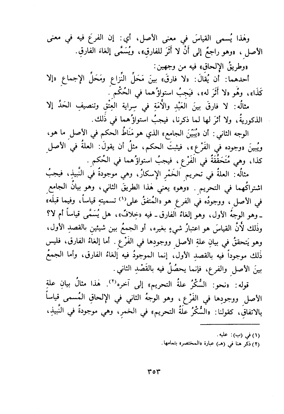 مِثَالُهُ: الْعِلَّةُ فِي تَحْرِيمِ الْخَمْرِ الْإِسْكَارُ، وَهِيَ مَوْجُودَةٌ فِي النَّبِيذِ، فَيَجِبُ اشْتِرَاكُهُمَا فِي التَّحْرِيمِ. " وَهُوَ " يَعْنِي هَذَا الطَّرِيقَ الثَّانِيَ، وَهُوَ بَيَانُ الْجَامِعِ فِي الْأَصْلِ، وَوُجُودُهُ فِي الْفَرْعِ هُوَ " الْمُتَّفَقُ عَلَى تَسْمِيَتِهِ قِيَاسًا، وَفِيمَا قَبْلَهُ " وَهُوَ الْوَجْهُ الْأَوَّلُ، وَهُوَ إِلْغَاءُ الْفَارِقِ فِيهِ " خِلَافٌ " هَلْ يُسَمَّى قِيَاسًا أَمْ لَا؟ وَذَلِكَ لِأَنَّ الْقِيَاسَ هُوَ اعْتِبَارُ شَيْءٍ بِغَيْرِهِ، أَوِ الْجَمْعُ بَيْنَ شَيْئَيْنِ بِالْقَصْدِ الْأَوَّلِ، وَهُوَ يَتَحَقَّقُ فِي بَيَانِ عِلَّةِ الْأَصْلِ وَوُجُودِهَا فِي الْفَرْعِ. أَمَّا إِلْغَاءُ الْفَارِقِ، فَلَيْسَ ذَلِكَ مَوْجُودًا فِيهِ بِالْقَصْدِ الْأَوَّلِ، إِنَّمَا الْمَوْجُودُ فِيهِ إِلْغَاءُ الْفَارِقِ، وَأَمَّا الْجَمْعُ بَيْنَ الْأَصْلِ وَالْفَرْعِ، فَإِنَّمَا يَحْصُلُ فِيهِ بِالْقَصْدِ الثَّانِي.