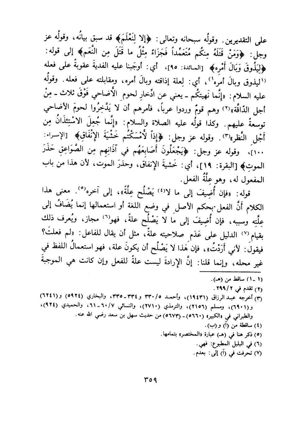 عَلَى التَّقْدِيرَيْنِ. وَقَوْلُهُ - سُبْحَانَهُ وَتَعَالَى -: (إِلَّا لِنَعْلَمَ) قَدْ سَبَقَ بَيَانُهُ، وَقَوْلُهُ - عَزَّ وَجَلَّ -: {وَمَنْ قَتَلَهُ مِنْكُمْ مُتَعَمِّدًا فَجَزَاءٌ مِثْلُ مَا قَتَلَ مِنَ النَّعَمِ} إِلَى قَوْلِهِ: {لِيَذُوقَ وَبَالَ أَمْرِهِ} [الْمَائِدَةِ: 95] ، أَيْ: أَوْجَبْنَا عَلَيْهِ الْفِدْيَةَ عُقُوبَةً عَلَى فِعْلِهِ لِيَذُوقَ وَبَالَ أَمْرِهِ، أَيْ: لِعِلَّةِ إِذَاقَتِهِ وَبَالَ أَمْرِهِ، وَمُقَابَلَتِهِ عَلَى فِعْلِهِ. وَقَوْلُهُ - عَلَيْهِ السَّلَامُ -: إِنَّمَا نَهَيْتُكُمْ يَعْنِي عَنِ ادِّخَارِ لُحُومِ الْأَضَاحِي فَوْقَ ثَلَاثٍ مِنْ أَجْلِ الدَّافَّةِ وَهُمْ قَوْمٌ وَرَدُوا عَرَبًا، فَأَمَرَهُمْ أَنْ لَا يَدَّخِرُوا لُحُومَ الْأَضَاحِي تَوْسِعَةً عَلَيْهِمْ. وَكَذَا قَوْلُهُ - عَلَيْهِ الصَّلَاةُ وَالسَّلَامُ -: إِنَّمَا جُعِلَ الِاسْتِئْذَانُ مِنْ أَجْلِ النَّظَرِ. وَقَوْلُهُ - عَزَّ وَجَلَّ -: {إِذًا لَأَمْسَكْتُمْ خَشْيَةَ الْإِنْفَاقِ} [الْإِسْرَاءِ: 100] ، وَقَوْلُهُ - عَزَّ وَجَلَّ -: {يَجْعَلُونَ أَصَابِعَهُمْ فِي آذَانِهِمْ مِنَ الصَّوَاعِقِ حَذَرَ الْمَوْتِ} [الْبَقَرَةِ: 19] ، أَيْ: خَشْيَةَ الْإِنْفَاقِ، وَحَذَرَ الْمَوْتِ، لِأَنَّ هَذَا مِنْ بَابِ الْمَفْعُولِ لَهُ، وَهُوَ عِلَّةُ الْفِعْلِ.