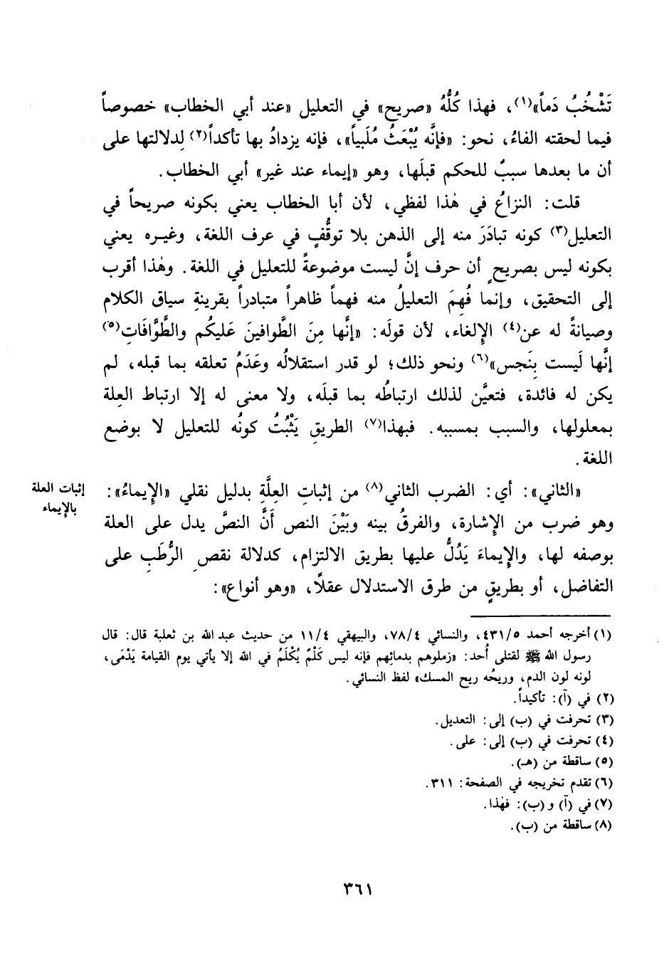 تَشْخُبُ دَمًا، فَهَذَا كُلُّهُ " صَرِيحٌ " فِي التَّعْلِيلِ " عِنْدَ أَبِي الْخَطَّابِ " خُصُوصًا فِيمَا لَحِقَتْهُ الْفَاءُ، نَحْوَ: فَإِنَّهُ يُبْعَثُ مُلَبِّيًا، فَإِنَّهُ يَزْدَادُ بِهَا تَأَكُّدًا لِدَلَالَتِهَا عَلَى أَنَّ مَا بَعْدَهَا سَبَبٌ لِلْحُكْمِ قَبْلَهَا، وَهُوَ " إِيمَاءٌ عِنْدَ غَيْرِ " أَبِي الْخَطَّابِ.