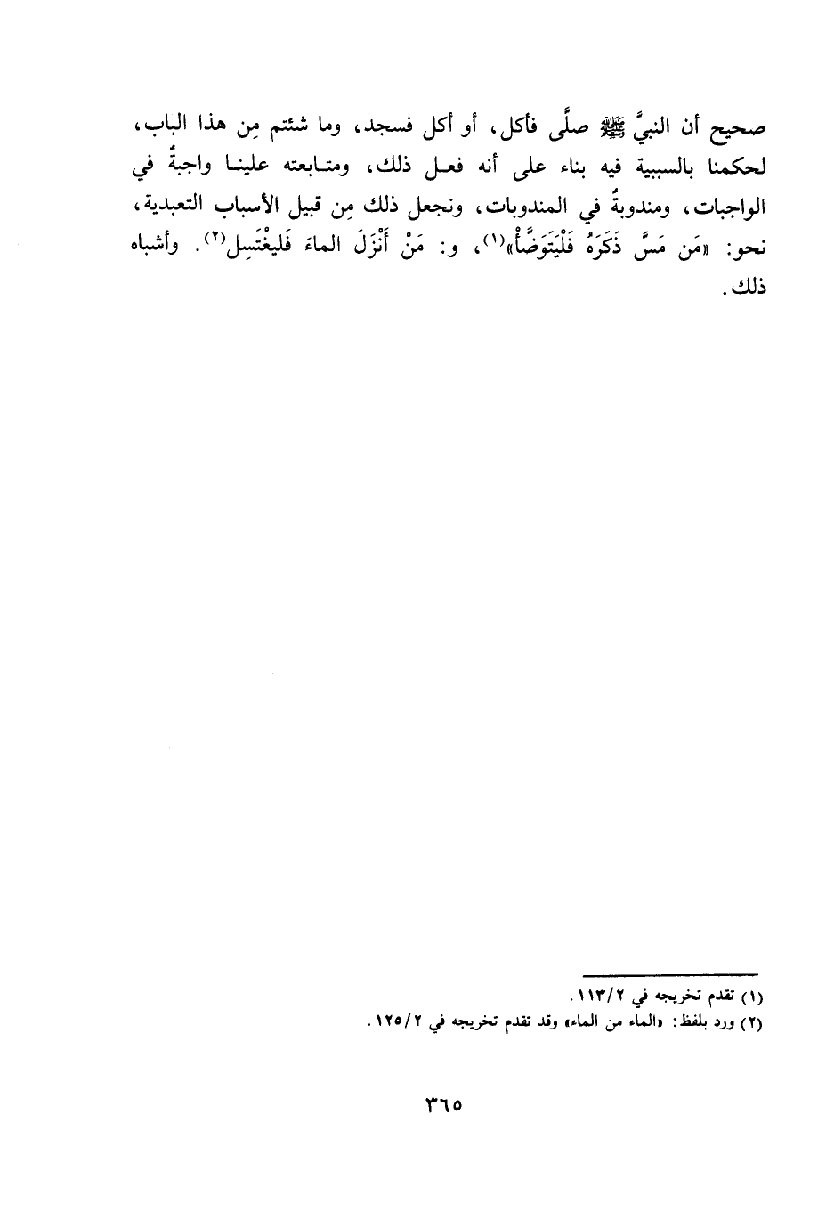 صَحِيحٍ أَنَّ النَّبِيَّ - صَلَّى اللَّهُ عَلَيْهِ وَسَلَّمَ - صَلَّى فَأَكَلَ، أَوْ أَكَلَ فَسَجَدَ، وَمَا شِئْتُمْ مِنْ هَذَا الْبَابِ، لَحَكَمْنَا بِالسَّبَبِيَّةِ فِيهِ بِنَاءً عَلَى أَنَّهُ فَعَلَ ذَلِكَ، وَمُتَابَعَتُهُ عَلَيْنَا وَاجِبَةٌ فِي الْوَاجِبَاتِ، وَمَنْدُوبَةٌ فِي الْمَنْدُوبَاتِ، وَنَجْعَلُ ذَلِكَ مِنْ قَبِيلِ الْأَسْبَابِ التَّعَبُّدِيَّةِ، نَحْوَ: مَنْ مَسَّ ذَكَرَهُ فَلْيَتَوَضَّأْ، وَ: مَنْ أَنْزَلَ الْمَاءَ فَلْيَغْتَسِلْ. وَأَشْبَاهِ ذَلِكَ.